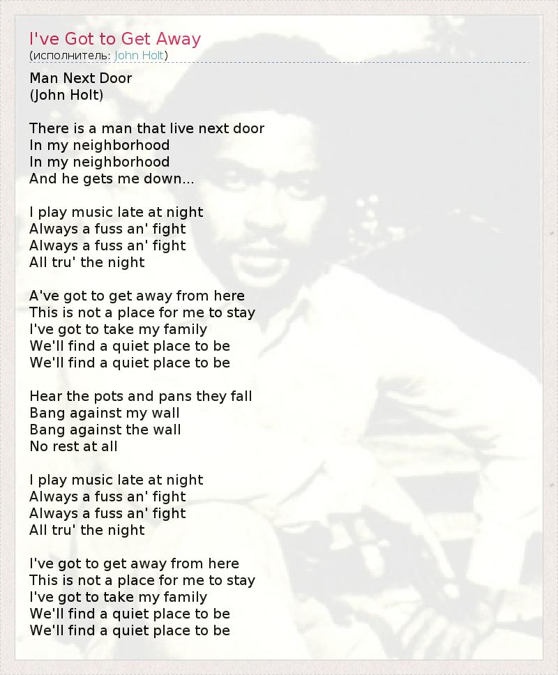 Man Next Door (John Holt) There is a man that live next door In my neighborhood In my neighborhood And he gets me down... I play music late at night Always a fuss an' fight Always a fuss an' fight All tru' the night A've got to get away from here This is not a place for me to stay I've got to take my family We'll find a quiet place to be We'll find a quiet place to be Hear the pots and pans they fall Bang against my wall Bang against the wall No rest at all I play music late at night Always a fuss an' fight Always a fuss an' fight All tru' the night I've got to get away from here This is not a place for me to stay I've got to take my family We'll find a quiet place to be We'll find a quiet place to be