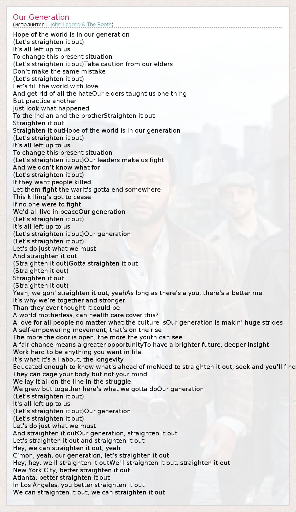 Это интересно:В 2009 году во время 44-х президентских выборов США, композитору и исполнителю Джону Ледженду (John Legend) и группе The Roots впервые пришла идея создания совместного альбома. И вот, спустя полтора года, 21 сентября 2010 года вышел первый результат сотрудничества шестикратного победителя премии Грэмми с филадельфийскими легендами хип хопа - альбом "Wake Up!" ("Проснись!").... продолжение