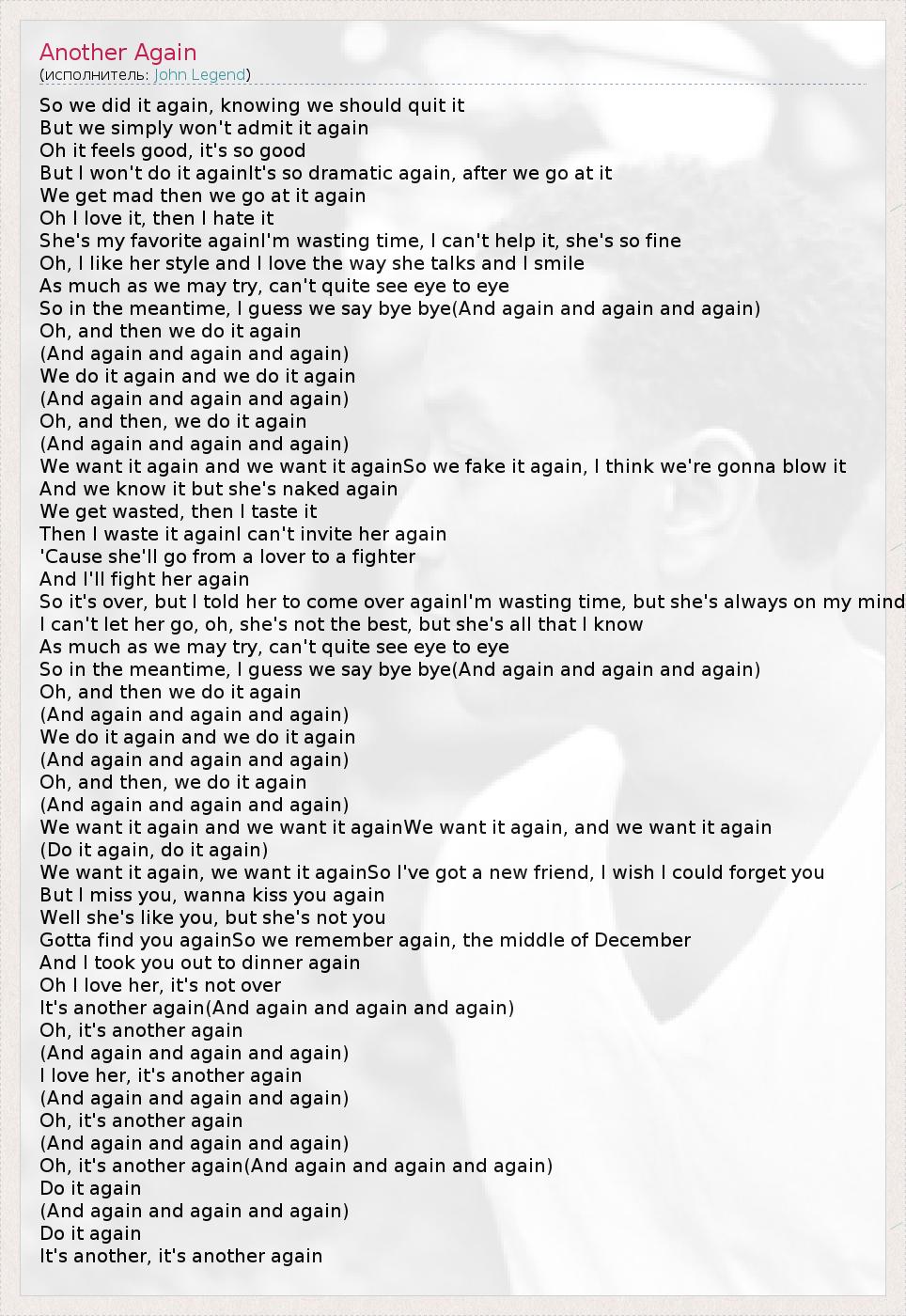 So we did it again, knowing we should quit it But we simply won't admit it again Oh it feels good, it's so good But I won't do it againIt's so dramatic again, after we go at it We get mad then we go at it again Oh I love it, then I hate it She's my favorite againI'm wasting time, I can't help it, she's so fine Oh, I like her style and I love the way she talks and I smile As much as we may try, can't quite see eye to eye So in the meantime, I guess we say bye bye(And again and again and again) Oh, and then we do it again (And again and again and again) We do it again and we do it again (And again and again and again) Oh, and then, we do it again (And again and again and again) We want it again and we want it againSo we fake it again, I think we're gonna blow it And we know it but she's naked again We get wasted, then I taste it Then I waste it againI can't invite her again 'Cause she'll go from a lover to a fighter And I'll fight her again So it's over, but I told her to come over againI'm wasting time, but she's always on my mind I can't let her go, oh, she's not the best, but she's all that I know As much as we may try, can't quite see eye to eye So in the meantime, I guess we say bye bye(And again and again and again) Oh, and then we do it again (And again and again and again) We do it again and we do it again (And again and again and again) Oh, and then, we do it again (And again and again and again) We want it again and we want it againWe want it again, and we want it again (Do it again, do it again) We want it again, we want it againSo I've got a new friend, I wish I could forget you But I miss you, wanna kiss you again Well she's like you, but she's not you Gotta find you againSo we remember again, the middle of December And I took you out to dinner again Oh I love her, it's not over It's another again(And again and again and again) Oh, it's another again (And again and again and again) I love her, it's another again (And again and again and again) Oh, it's another again (And again and again and again) Oh, it's another again(And again and again and again) Do it again (And again and again and again) Do it again It's another, it's another again