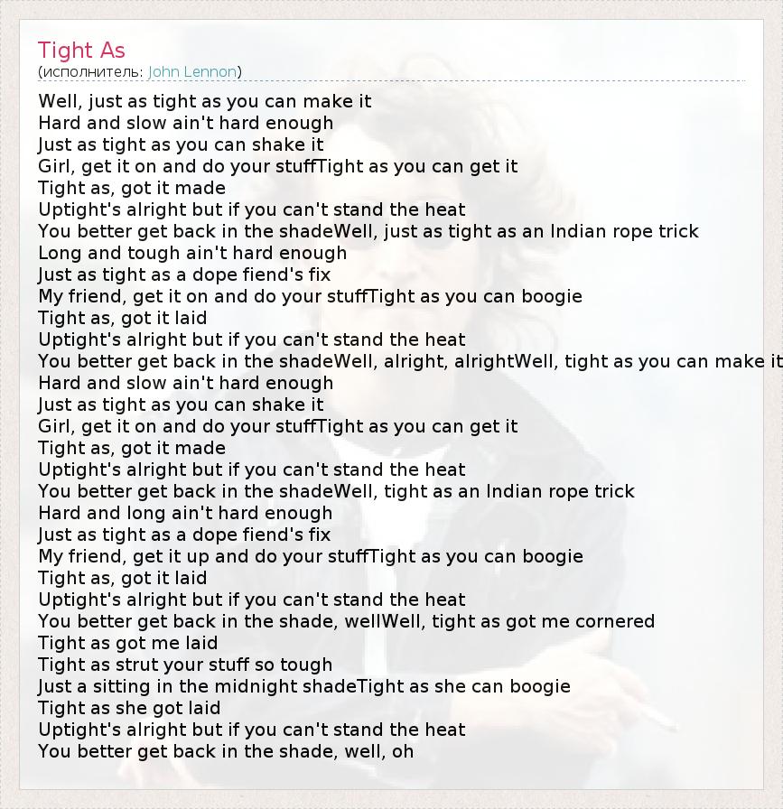 Well, just as tight as you can make it Hard and slow ain't hard enough Just as tight as you can shake it Girl, get it on and do your stuffTight as you can get it Tight as, got it made Uptight's alright but if you can't stand the heat You better get back in the shadeWell, just as tight as an Indian rope trick Long and tough ain't hard enough Just as tight as a dope fiend's fix My friend, get it on and do your stuffTight as you can boogie Tight as, got it laid Uptight's alright but if you can't stand the heat You better get back in the shadeWell, alright, alrightWell, tight as you can make it Hard and slow ain't hard enough Just as tight as you can shake it Girl, get it on and do your stuffTight as you can get it Tight as, got it made Uptight's alright but if you can't stand the heat You better get back in the shadeWell, tight as an Indian rope trick Hard and long ain't hard enough Just as tight as a dope fiend's fix My friend, get it up and do your stuffTight as you can boogie Tight as, got it laid Uptight's alright but if you can't stand the heat You better get back in the shade, wellWell, tight as got me cornered Tight as got me laid Tight as strut your stuff so tough Just a sitting in the midnight shadeTight as she can boogie Tight as she got laid Uptight's alright but if you can't stand the heat You better get back in the shade, well, oh