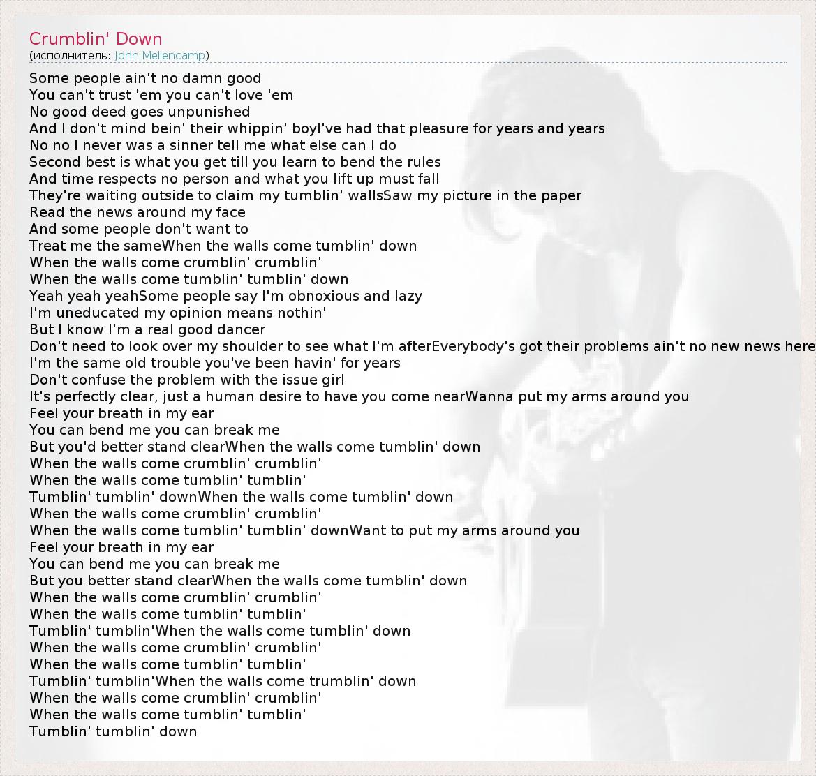 Some people ain't no damn good You can't trust 'em you can't love 'em No good deed goes unpunished And I don't mind bein' their whippin' boyI've had that pleasure for years and years No no I never was a sinner tell me what else can I do Second best is what you get till you learn to bend the rules And time respects no person and what you lift up must fall They're waiting outside to claim my tumblin' wallsSaw my picture in the paper Read the news around my face And some people don't want to Treat me the sameWhen the walls come tumblin' down When the walls come crumblin' crumblin' When the walls come tumblin' tumblin' down Yeah yeah yeahSome people say I'm obnoxious and lazy I'm uneducated my opinion means nothin' But I know I'm a real good dancer Don't need to look over my shoulder to see what I'm afterEverybody's got their problems ain't no new news here I'm the same old trouble you've been havin' for years Don't confuse the problem with the issue girl It's perfectly clear, just a human desire to have you come nearWanna put my arms around you Feel your breath in my ear You can bend me you can break me But you'd better stand clearWhen the walls come tumblin' down When the walls come crumblin' crumblin' When the walls come tumblin' tumblin' Tumblin' tumblin' downWhen the walls come tumblin' down When the walls come crumblin' crumblin' When the walls come tumblin' tumblin' downWant to put my arms around you Feel your breath in my ear You can bend me you can break me But you better stand clearWhen the walls come tumblin' down When the walls come crumblin' crumblin' When the walls come tumblin' tumblin' Tumblin' tumblin'When the walls come tumblin' down When the walls come crumblin' crumblin' When the walls come tumblin' tumblin' Tumblin' tumblin'When the walls come trumblin' down When the walls come crumblin' crumblin' When the walls come tumblin' tumblin' Tumblin' tumblin' down