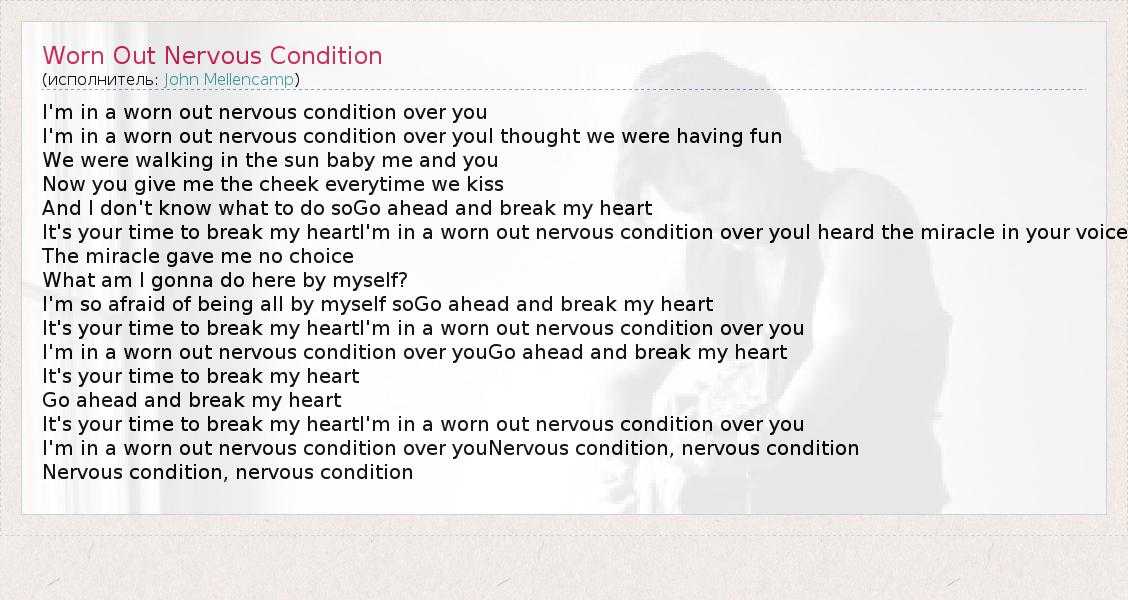 I'm in a worn out nervous condition over you I'm in a worn out nervous condition over youI thought we were having fun We were walking in the sun baby me and you Now you give me the cheek everytime we kiss And I don't know what to do soGo ahead and break my heart It's your time to break my heartI'm in a worn out nervous condition over youI heard the miracle in your voice The miracle gave me no choice What am I gonna do here by myself? I'm so afraid of being all by myself soGo ahead and break my heart It's your time to break my heartI'm in a worn out nervous condition over you I'm in a worn out nervous condition over youGo ahead and break my heart It's your time to break my heart Go ahead and break my heart It's your time to break my heartI'm in a worn out nervous condition over you I'm in a worn out nervous condition over youNervous condition, nervous condition Nervous condition, nervous condition