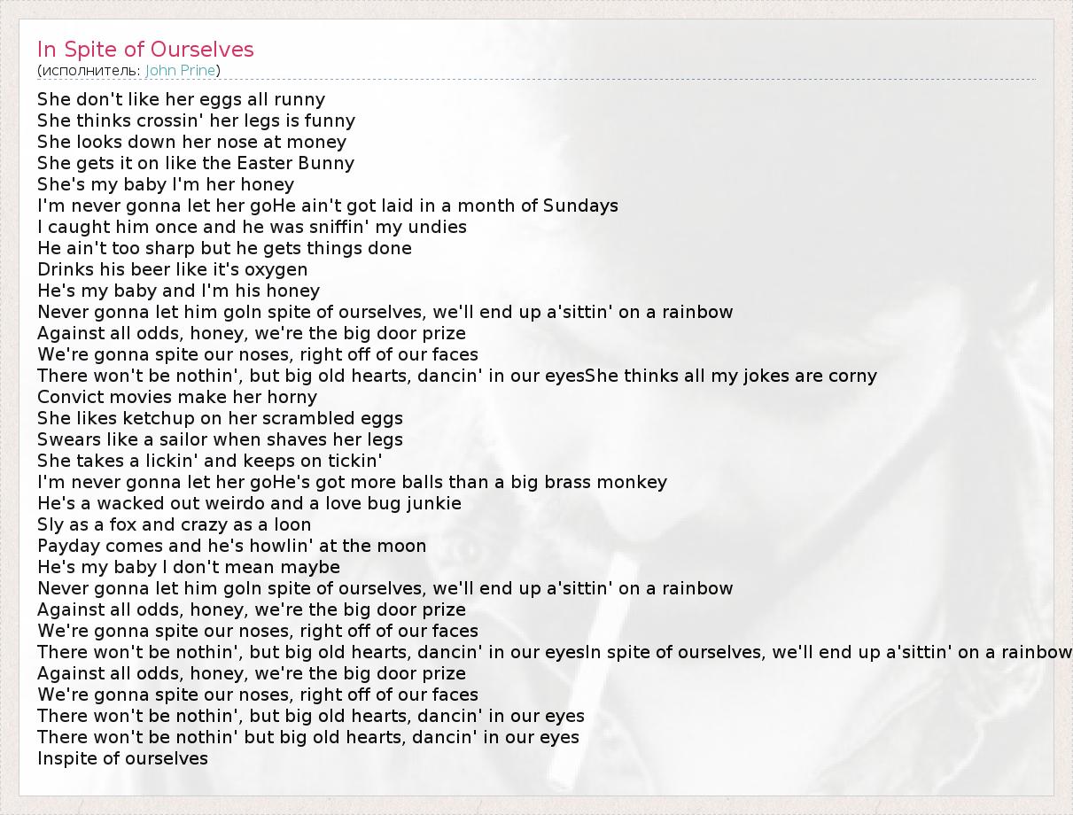 She don't like her eggs all runny She thinks crossin' her legs is funny She looks down her nose at money She gets it on like the Easter Bunny She's my baby I'm her honey I'm never gonna let her goHe ain't got laid in a month of Sundays I caught him once and he was sniffin' my undies He ain't too sharp but he gets things done Drinks his beer like it's oxygen He's my baby and I'm his honey Never gonna let him goIn spite of ourselves, we'll end up a'sittin' on a rainbow Against all odds, honey, we're the big door prize We're gonna spite our noses, right off of our faces There won't be nothin', but big old hearts, dancin' in our eyesShe thinks all my jokes are corny Convict movies make her horny She likes ketchup on her scrambled eggs Swears like a sailor when shaves her legs She takes a lickin' and keeps on tickin' I'm never gonna let her goHe's got more balls than a big brass monkey He's a wacked out weirdo and a love bug junkie Sly as a fox and crazy as a loon Payday comes and he's howlin' at the moon He's my baby I don't mean maybe Never gonna let him goIn spite of ourselves, we'll end up a'sittin' on a rainbow Against all odds, honey, we're the big door prize We're gonna spite our noses, right off of our faces There won't be nothin', but big old hearts, dancin' in our eyesIn spite of ourselves, we'll end up a'sittin' on a rainbow Against all odds, honey, we're the big door prize We're gonna spite our noses, right off of our faces There won't be nothin', but big old hearts, dancin' in our eyes There won't be nothin' but big old hearts, dancin' in our eyes Inspite of ourselves