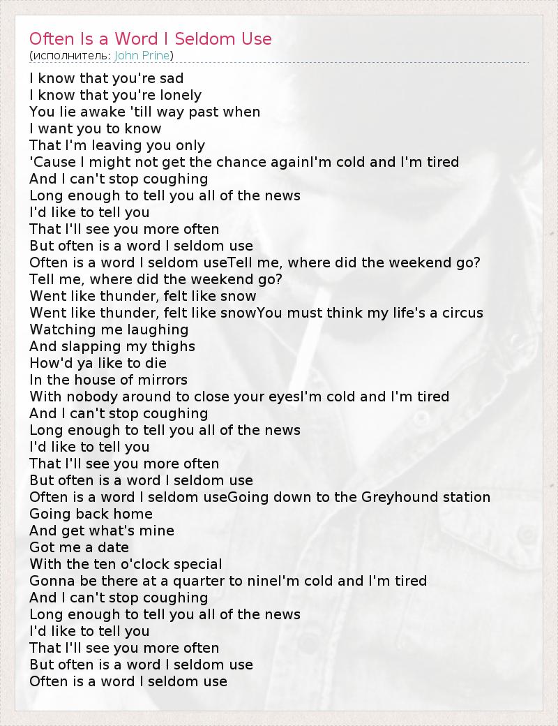 I know that you're sad I know that you're lonely You lie awake 'till way past when I want you to know That I'm leaving you only 'Cause I might not get the chance againI'm cold and I'm tired And I can't stop coughing Long enough to tell you all of the news I'd like to tell you That I'll see you more often But often is a word I seldom use Often is a word I seldom useTell me, where did the weekend go? Tell me, where did the weekend go? Went like thunder, felt like snow Went like thunder, felt like snowYou must think my life's a circus Watching me laughing And slapping my thighs How'd ya like to die In the house of mirrors With nobody around to close your eyesI'm cold and I'm tired And I can't stop coughing Long enough to tell you all of the news I'd like to tell you That I'll see you more often But often is a word I seldom use Often is a word I seldom useGoing down to the Greyhound station Going back home And get what's mine Got me a date With the ten o'clock special Gonna be there at a quarter to nineI'm cold and I'm tired And I can't stop coughing Long enough to tell you all of the news I'd like to tell you That I'll see you more often But often is a word I seldom use Often is a word I seldom use