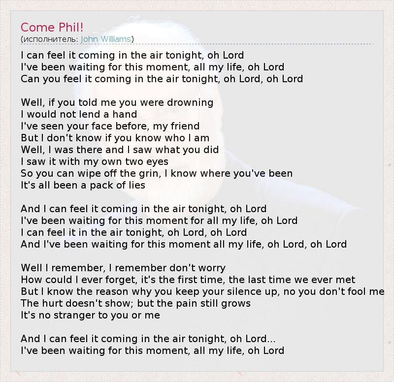 I can feel it coming in the air tonight, oh Lord I've been waiting for this moment, all my life, oh Lord Can you feel it coming in the air tonight, oh Lord, oh Lord Well, if you told me you were drowning I would not lend a hand I've seen your face before, my friend But I don't know if you know who I am Well, I was there and I saw what you did I saw it with my own two eyes So you can wipe off the grin, I know where you've been It's all been a pack of lies And I can feel it coming in the air tonight, oh Lord I've been waiting for this moment for all my life, oh Lord I can feel it in the air tonight, oh Lord, oh Lord And I've been waiting for this moment all my life, oh Lord, oh Lord Well I remember, I remember don't worry How could I ever forget, it's the first time, the last time we ever met But I know the reason why you keep your silence up, no you don't fool me The hurt doesn't show; but the pain still grows It's no stranger to you or me And I can feel it coming in the air tonight, oh Lord... I've been waiting for this moment, all my life, oh Lord