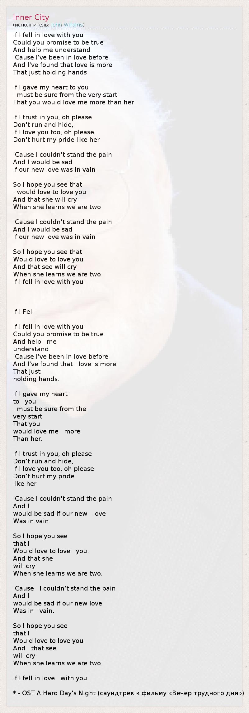If I fell in love with you Could you promise to be true And help me understand 'Cause I've been in love before And I've found that love is more That just holding hands If I gave my heart to you I must be sure from the very start That you would love me more than her If I trust in you, oh please Don't run and hide, If I love you too, oh please Don't hurt my pride like her 'Cause I couldn't stand the pain And I would be sad If our new love was in vain So I hope you see that I would love to love you And that she will cry When she learns we are two 'Cause I couldn't stand the pain And I would be sad If our new love was in vain So I hope you see that I Would love to love you And that see will cry When she learns we are two If I fell in love with you If I Fell If I fell in love with you Could you promise to be true And help me understand 'Cause I've been in love before And I've found that love is more That just holding hands. If I gave my heart to you I must be sure from the very start That you would love me more Than her. If I trust in you, oh please Don't run and hide, If I love you too, oh please Don't hurt my pride like her 'Cause I couldn't stand the pain And I would be sad if our new love Was in vain So I hope you see that I Would love to love you. And that she will cry When she learns we are two. 'Cause I couldn't stand the pain And I would be sad if our new love Was in vain. So I hope you see that I Would love to love you And that see will cry When she learns we are two If I fell in love with you * - OST A Hard Day's Night (саундтрек к фильму «Вечер трудного дня»)