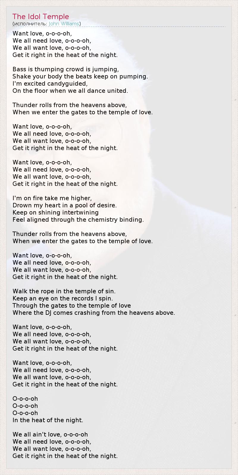 Want love, o-o-o-oh, We all need love, o-o-o-oh, We all want love, o-o-o-oh, Get it right in the heat of the night. Bass is thumping crowd is jumping, Shake your body the beats keep on pumping. I'm excited candyguided, On the floor when we all dance united. Thunder rolls from the heavens above, When we enter the gates to the temple of love. Want love, o-o-o-oh, We all need love, o-o-o-oh, We all want love, o-o-o-oh, Get it right in the heat of the night. Want love, o-o-o-oh, We all need love, o-o-o-oh, We all want love, o-o-o-oh, Get it right in the heat of the night. I'm on fire take me higher, Drown my heart in a pool of desire. Keep on shining intertwining Feel aligned through the chemistry binding. Thunder rolls from the heavens above, When we enter the gates to the temple of love. Want love, o-o-o-oh, We all need love, o-o-o-oh, We all want love, o-o-o-oh, Get it right in the heat of the night. Walk the rope in the temple of sin. Keep an eye on the records I spin. Through the gates to the temple of love Where the DJ comes crashing from the heavens above. Want love, o-o-o-oh, We all need love, o-o-o-oh, We all want love, o-o-o-oh, Get it right in the heat of the night. Want love, o-o-o-oh, We all need love, o-o-o-oh, We all want love, o-o-o-oh, Get it right in the heat of the night. O-o-o-oh O-o-o-oh O-o-o-oh In the heat of the night. We all ain't love, o-o-o-oh We all need love, o-o-o-oh, We all want love, o-o-o-oh, Get it right in the heat of the night.