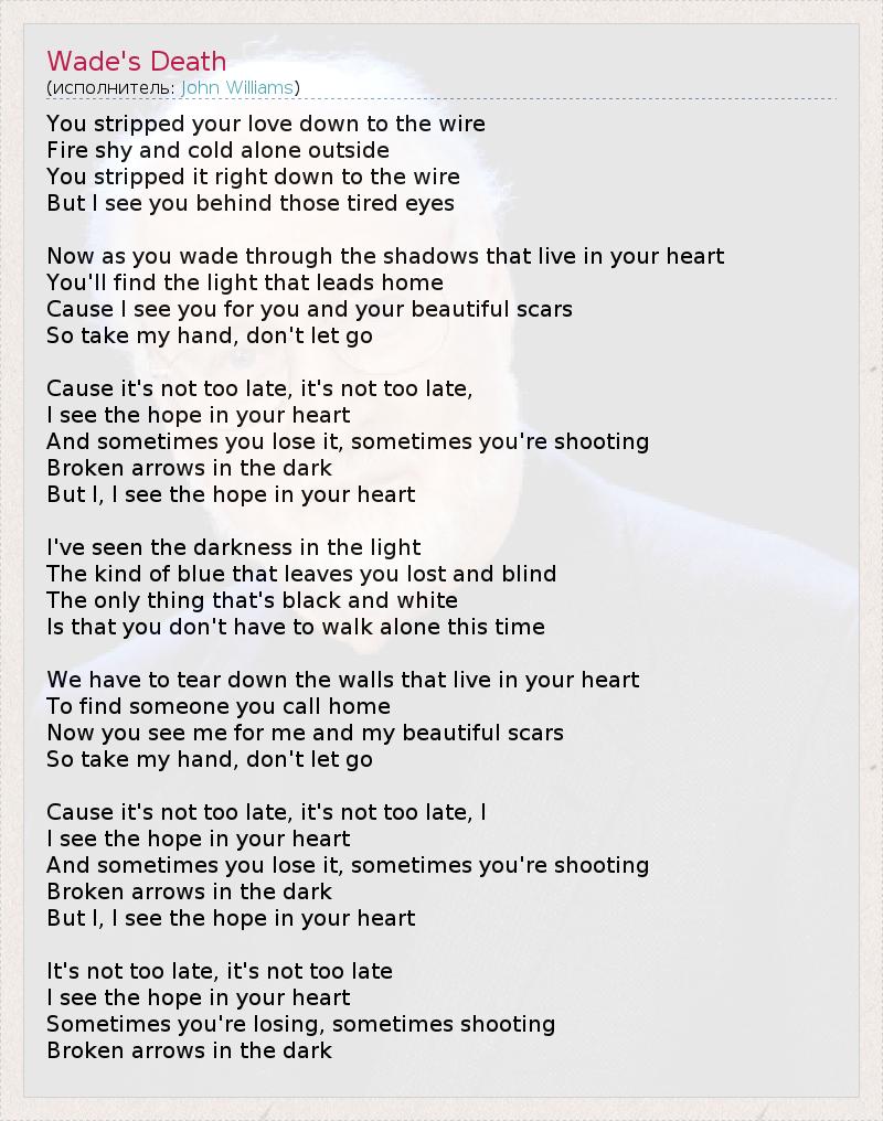 Ты обнажила свою любовь до предела, Вспыхивая от стыда и замерзая одна на улице. Ты обнажила её до полного предела, Но я вижу тебя за этими уставшими глазами. Теперь, когда ты миновала тени, что живут в твоей душе, Ты найдешь свет, который приведет тебя домой, Потому что я вижу, что ты – это ты, и твои прекрасные шрамы. Возьми же мою руку, не отпускай меня. Потому что еще не поздно, еще не поздно, Я вижу надежду в твоем сердце, Но иногда ты теряешь ее, иногда ты пускаешь Сломанные стрелы в темноту, Но я вижу надежду в твоем сердце. Я вижу тьму среди света, Печаль, что делает тебя потерянной и ослепленной. Единственное, что совершенно ясно, Это то, что теперь ты не должна быть одна. Мы должны сломать стены, возведенные в твоем сердце, Чтобы найти того, кого ты позовешь домой. Теперь ты видишь, что я – это я, и мои прекрасные шрамы. Возьми же мою руку, не отпускай меня. Потому что еще не поздно, еще не поздно, Я вижу надежду в твоем сердце, Но иногда ты теряешь ее, иногда ты пускаешь Сломанные стрелы в темноту, Но я вижу надежду в твоем сердце. Потому что еще не поздно, еще не поздно, Я вижу надежду в твоем сердце. Иногда ты теряешь ее, иногда ты пускаешь Сломанные стрелы в темноту...