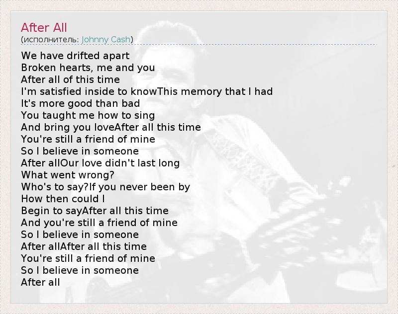 We have drifted apart Broken hearts, me and you After all of this time I'm satisfied inside to knowThis memory that I had It's more good than bad You taught me how to sing And bring you loveAfter all this time You're still a friend of mine So I believe in someone After allOur love didn't last long What went wrong? Who's to say?If you never been by How then could I Begin to sayAfter all this time And you're still a friend of mine So I believe in someone After allAfter all this time You're still a friend of mine So I believe in someone After all