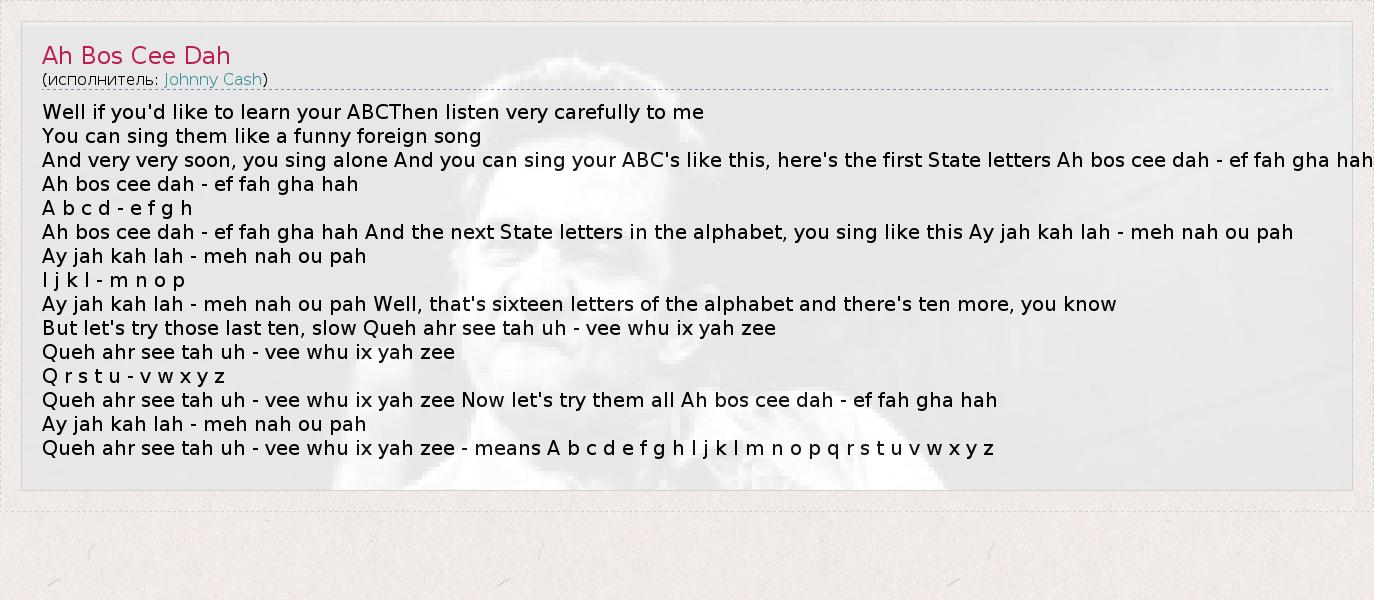 Well if you'd like to learn your ABCThen listen very carefully to me You can sing them like a funny foreign song And very very soon, you sing alone And you can sing your ABC's like this, here's the first State letters Ah bos cee dah - ef fah gha hah Ah bos cee dah - ef fah gha hah A b c d - e f g h Ah bos cee dah - ef fah gha hah And the next State letters in the alphabet, you sing like this Ay jah kah lah - meh nah ou pah Ay jah kah lah - meh nah ou pah I j k l - m n o p Ay jah kah lah - meh nah ou pah Well, that's sixteen letters of the alphabet and there's ten more, you know But let's try those last ten, slow Queh ahr see tah uh - vee whu ix yah zee Queh ahr see tah uh - vee whu ix yah zee Q r s t u - v w x y z Queh ahr see tah uh - vee whu ix yah zee Now let's try them all Ah bos cee dah - ef fah gha hah Ay jah kah lah - meh nah ou pah Queh ahr see tah uh - vee whu ix yah zee - means A b c d e f g h I j k l m n o p q r s t u v w x y z