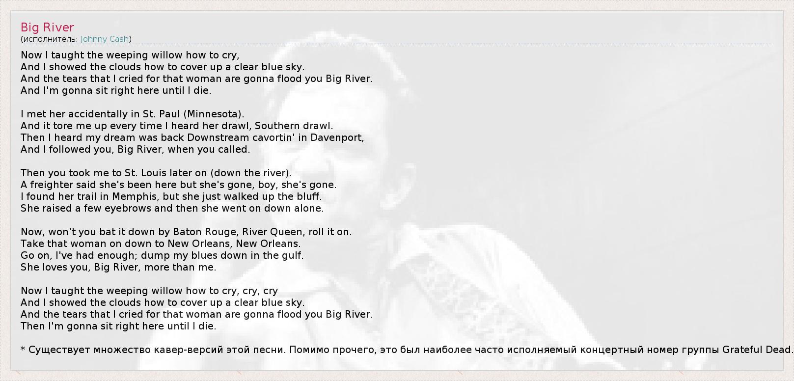 Это интересно:Джо́нни Кэш (англ. Johnny Cash; 26 февраля 1932, Кингсленд, Арканзас — 12 сентября 2003, Нашвилл, Теннесси) — американский певец и композитор-песенник, ключевая фигура в музыке кантри, считается одним из самых влиятельных музыкантов XX века. Несмотря на то, что в первую очередь его признали иконой кантри, исполнение песен в таких жанрах как госпел, рок-н-ролл и рокабилли — не редкость. Благодаря своей... продолжение