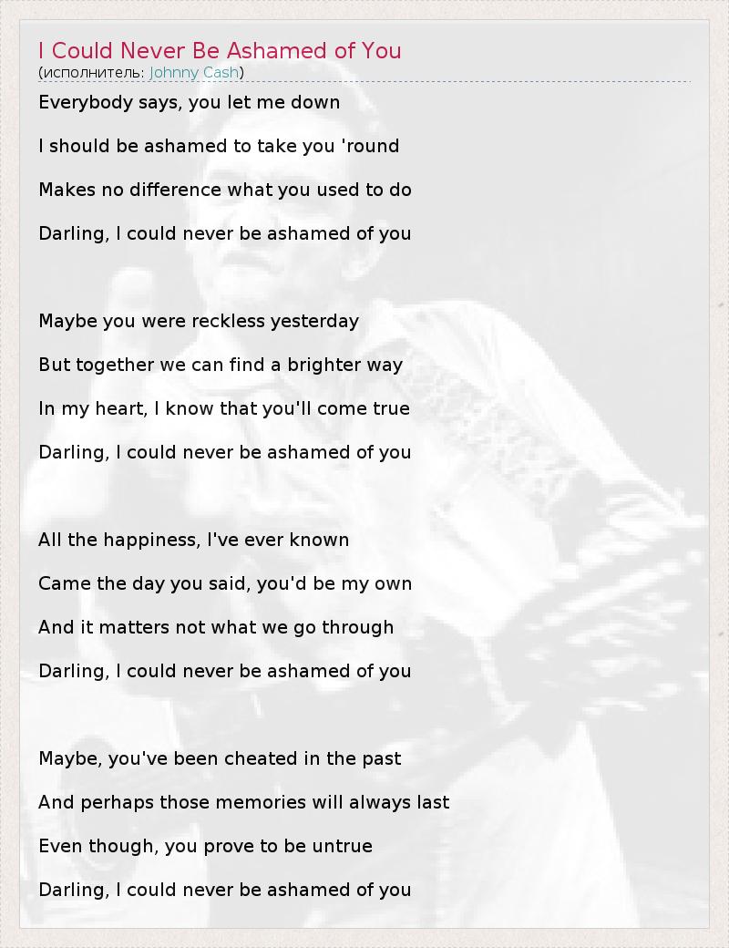 Everybody says, you let me down I should be ashamed to take you 'round Makes no difference what you used to do Darling, I could never be ashamed of you Maybe you were reckless yesterday But together we can find a brighter way In my heart, I know that you'll come true Darling, I could never be ashamed of you All the happiness, I've ever known Came the day you said, you'd be my own And it matters not what we go through Darling, I could never be ashamed of you Maybe, you've been cheated in the past And perhaps those memories will always last Even though, you prove to be untrue Darling, I could never be ashamed of you