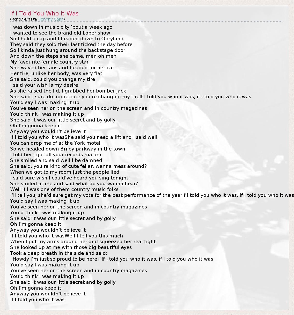 I was down in music city 'bout a week ago I wanted to see the brand old Loper show So I held a cap and I headed down to Opryland They said they sold their last ticked the day before So I kinda just hung around the backstage door And down the steps she came, men oh men My favourite female country star She waved her fans and headed for her car Her tire, unlike her body, was very flat She said, could you change my tire I said your wish is my desire As she raised the lid, I grabbed her bomber jack She said I sure do appreciate you're changing my tireIf I told you who it was, if I told you who it was You'd say I was making it up You've seen her on the screen and in country magazines You'd think I was making it up She said it was our little secret and by golly Oh I'm gonna keep it Anyway you wouldn't believe it If I told you who it wasShe said you need a lift and I said well You can drop me of at the York motel So we headed down Briley parkway in the town I told her I got all your records ma'am She smiled and said well I be damned She said, you're kind of cute fellar, wanna mess around? When we got to my room just the people lied I said sure wish I could've heard you sing tonight She smiled at me and said what do you wanna hear? Well if I was one of them country music folks I'll tell you, she'd sure get my vote for the best performance of the yearIf I told you who it was, if I told you who it was You'd say I was making it up You've seen her on the screen and in country magazines You'd think I was making it up She said it was our little secret and by golly Oh I'm gonna keep it Anyway you wouldn't believe it If I told you who it wasWell I tell you this much When I put my arms around her and squeezed her real tight She looked up at me with those big beautiful eyes Took a deep breath in the side and said: "Howdy I'm just so proud to be here!"If I told you who it was, if I told you who it was You'd say I was making it up You've seen her on the screen and in country magazines You'd think I was making it up She said it was our little secret and by golly Oh I'm gonna keep it Anyway you wouldn't believe it If I told you who it was