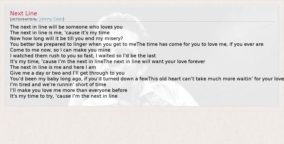 Это интересно:Джо́нни Кэш (англ. Johnny Cash; 26 февраля 1932, Кингсленд, Арканзас — 12 сентября 2003, Нашвилл, Теннесси) — американский певец и композитор-песенник, ключевая фигура в музыке кантри, считается одним из самых влиятельных музыкантов XX века. Несмотря на то, что в первую очередь его признали иконой кантри, исполнение песен в таких жанрах как госпел, рок-н-ролл и рокабилли — не редкость. Благодаря своей... продолжение