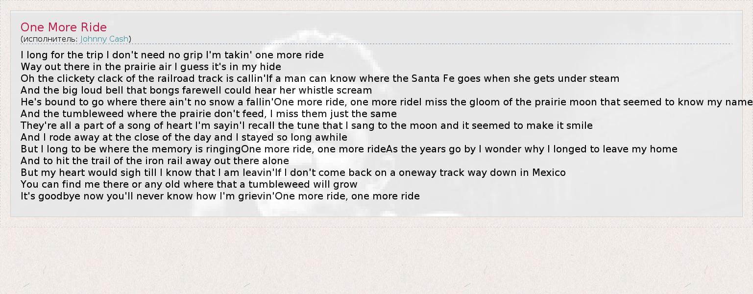 He's bound to go where there ain't no snow a fallin'One more ride, one more rideI miss the gloom of the prairie moon that seemed to know my name