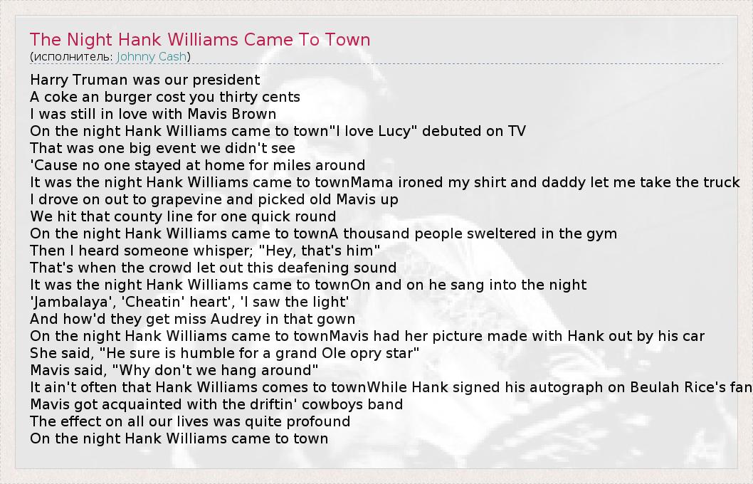 А как ты думаешь, о чем песня "The Night Hank Williams Came To Town" ?