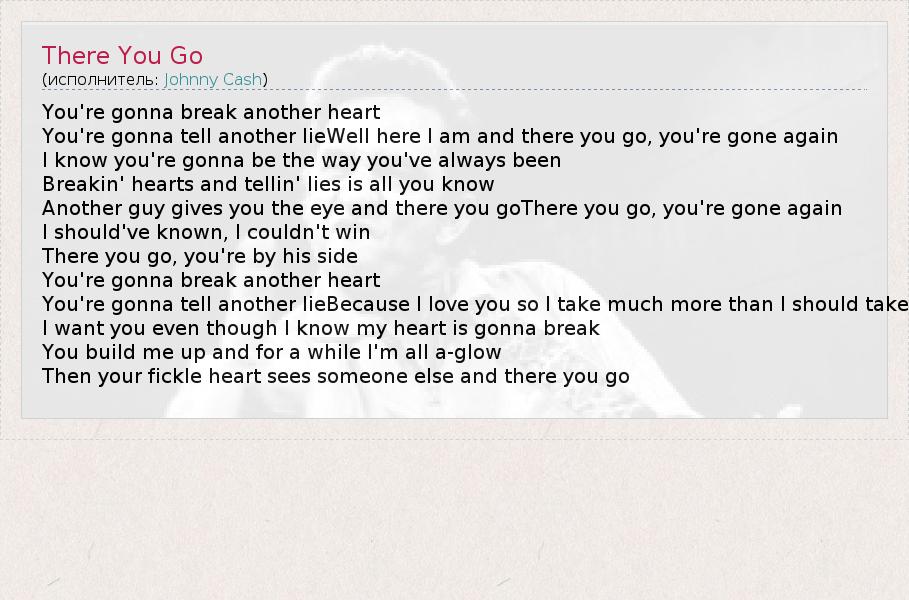 You're gonna break another heart You're gonna tell another lieWell here I am and there you go, you're gone again I know you're gonna be the way you've always been Breakin' hearts and tellin' lies is all you know Another guy gives you the eye and there you goThere you go, you're gone again I should've known, I couldn't win There you go, you're by his side You're gonna break another heart You're gonna tell another lieBecause I love you so I take much more than I should take I want you even though I know my heart is gonna break You build me up and for a while I'm all a-glow Then your fickle heart sees someone else and there you go