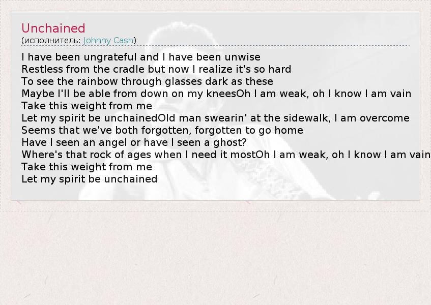Это интересно:Джо́нни Кэш (англ. Johnny Cash; 26 февраля 1932, Кингсленд, Арканзас — 12 сентября 2003, Нашвилл, Теннесси) — американский певец и композитор-песенник, ключевая фигура в музыке кантри, считается одним из самых влиятельных музыкантов XX века. Несмотря на то, что в первую очередь его признали иконой кантри, исполнение песен в таких жанрах как госпел, рок-н-ролл и рокабилли — не редкость. Благодаря своей... продолжение