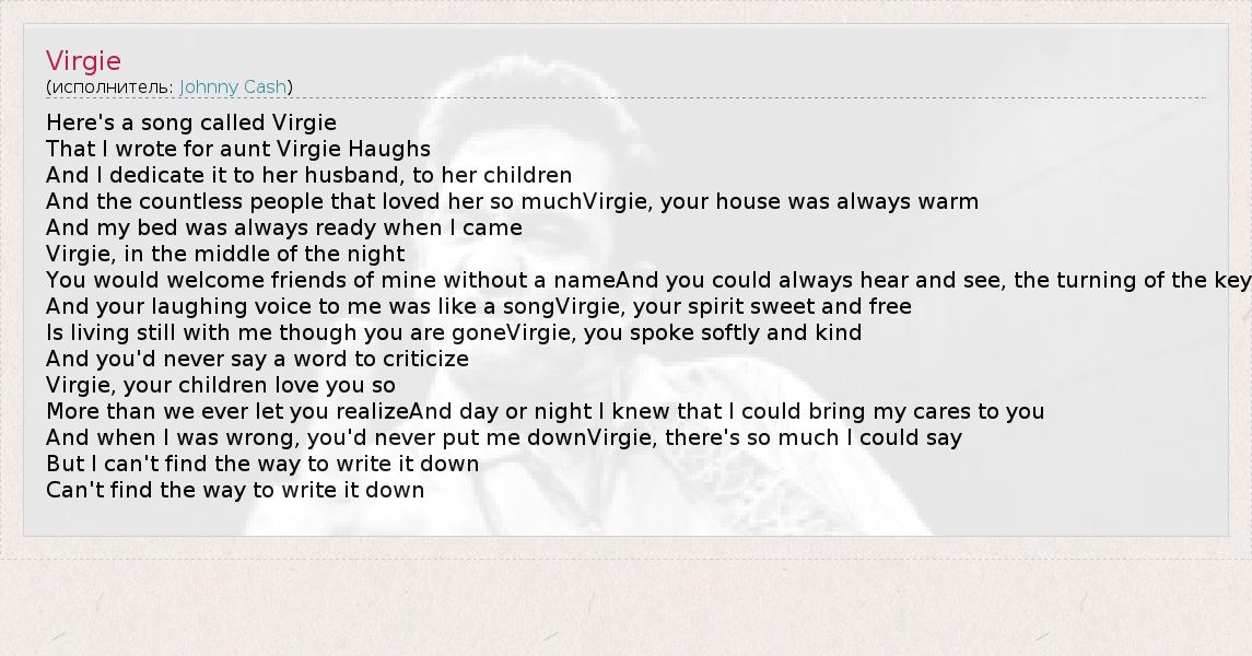 Это интересно:Джо́нни Кэш (англ. Johnny Cash; 26 февраля 1932, Кингсленд, Арканзас — 12 сентября 2003, Нашвилл, Теннесси) — американский певец и композитор-песенник, ключевая фигура в музыке кантри, считается одним из самых влиятельных музыкантов XX века. Несмотря на то, что в первую очередь его признали иконой кантри, исполнение песен в таких жанрах как госпел, рок-н-ролл и рокабилли — не редкость. Благодаря своей... продолжение