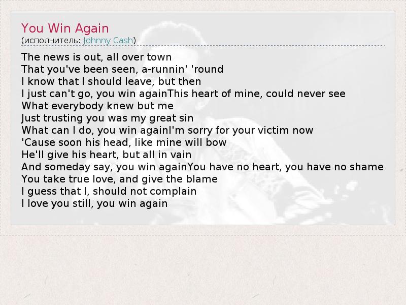 Это интересно:Джо́нни Кэш (англ. Johnny Cash; 26 февраля 1932, Кингсленд, Арканзас — 12 сентября 2003, Нашвилл, Теннесси) — американский певец и композитор-песенник, ключевая фигура в музыке кантри, считается одним из самых влиятельных музыкантов XX века. Несмотря на то, что в первую очередь его признали иконой кантри, исполнение песен в таких жанрах как госпел, рок-н-ролл и рокабилли — не редкость. Благодаря своей... продолжение