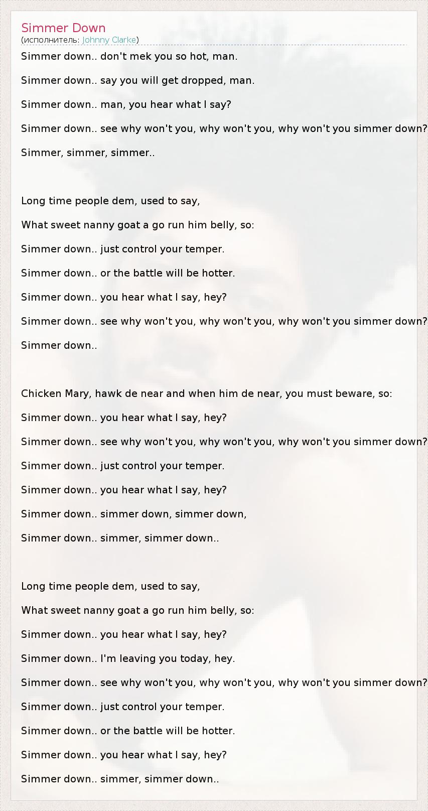 Это интересно:Johnny Clarke родился в 1955 году и вырос в гетто Кингстона в Вайтфилде, на Ямайке. Первую свою песню он записал в в 17 лет “God Made the Sea & Sun” которую продюсировал Clancy Eccles. Но успех к нему пришел после совместной работы с продюсером Bunny Lee. Под опекой Банни с 1975-76гг, Кларк стал одним из лучших новых певцов Ямайки. Его стиль сочетал в себе как воинственные песни, так и любовные, они снискали уважение многих... продолжение