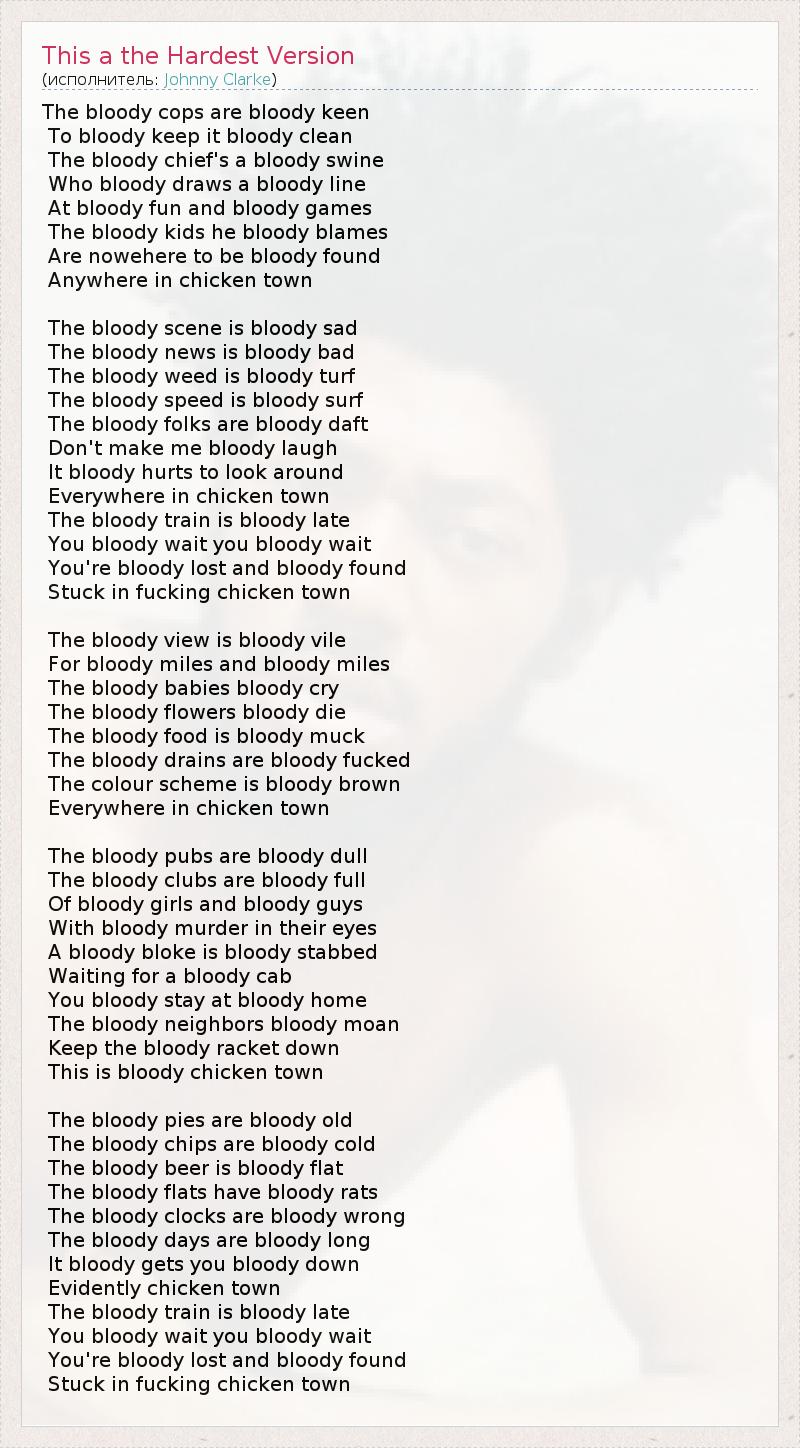 The bloody cops are bloody keen To bloody keep it bloody clean The bloody chief's a bloody swine Who bloody draws a bloody line At bloody fun and bloody games The bloody kids he bloody blames Are nowehere to be bloody found Anywhere in chicken town The bloody scene is bloody sad The bloody news is bloody bad The bloody weed is bloody turf The bloody speed is bloody surf The bloody folks are bloody daft Don't make me bloody laugh It bloody hurts to look around Everywhere in chicken town The bloody train is bloody late You bloody wait you bloody wait You're bloody lost and bloody found Stuck in fucking chicken town The bloody view is bloody vile For bloody miles and bloody miles The bloody babies bloody cry The bloody flowers bloody die The bloody food is bloody muck The bloody drains are bloody fucked The colour scheme is bloody brown Everywhere in chicken town The bloody pubs are bloody dull The bloody clubs are bloody full Of bloody girls and bloody guys With bloody murder in their eyes A bloody bloke is bloody stabbed Waiting for a bloody cab You bloody stay at bloody home The bloody neighbors bloody moan Keep the bloody racket down This is bloody chicken town The bloody pies are bloody old The bloody chips are bloody cold The bloody beer is bloody flat The bloody flats have bloody rats The bloody clocks are bloody wrong The bloody days are bloody long It bloody gets you bloody down Evidently chicken town The bloody train is bloody late You bloody wait you bloody wait You're bloody lost and bloody found Stuck in fucking chicken town