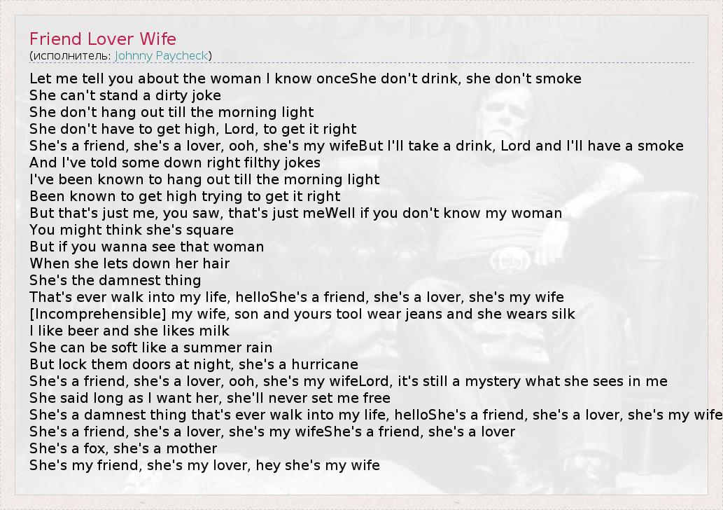 She's a friend, she's a lover, she's my wifeShe's a friend, she's a lover