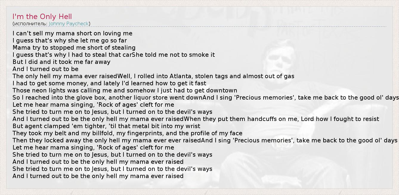 The only hell my mama ever raisedWell, I rolled into Atlanta, stolen tags and almost out of gas