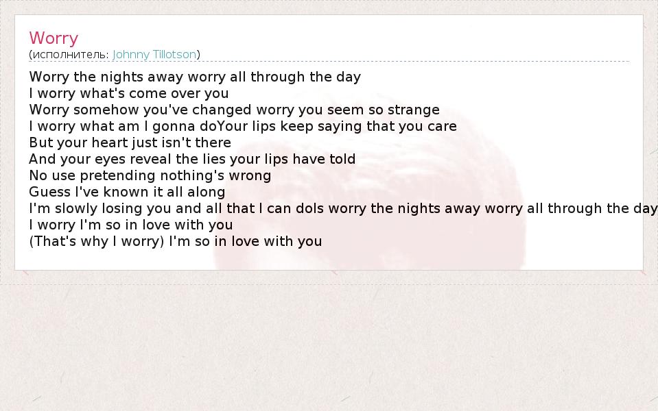 Worry the nights away worry all through the day I worry what's come over you Worry somehow you've changed worry you seem so strange I worry what am I gonna doYour lips keep saying that you care But your heart just isn't there And your eyes reveal the lies your lips have told No use pretending nothing's wrong Guess I've known it all along I'm slowly losing you and all that I can doIs worry the nights away worry all through the day I worry I'm so in love with you (That's why I worry) I'm so in love with you