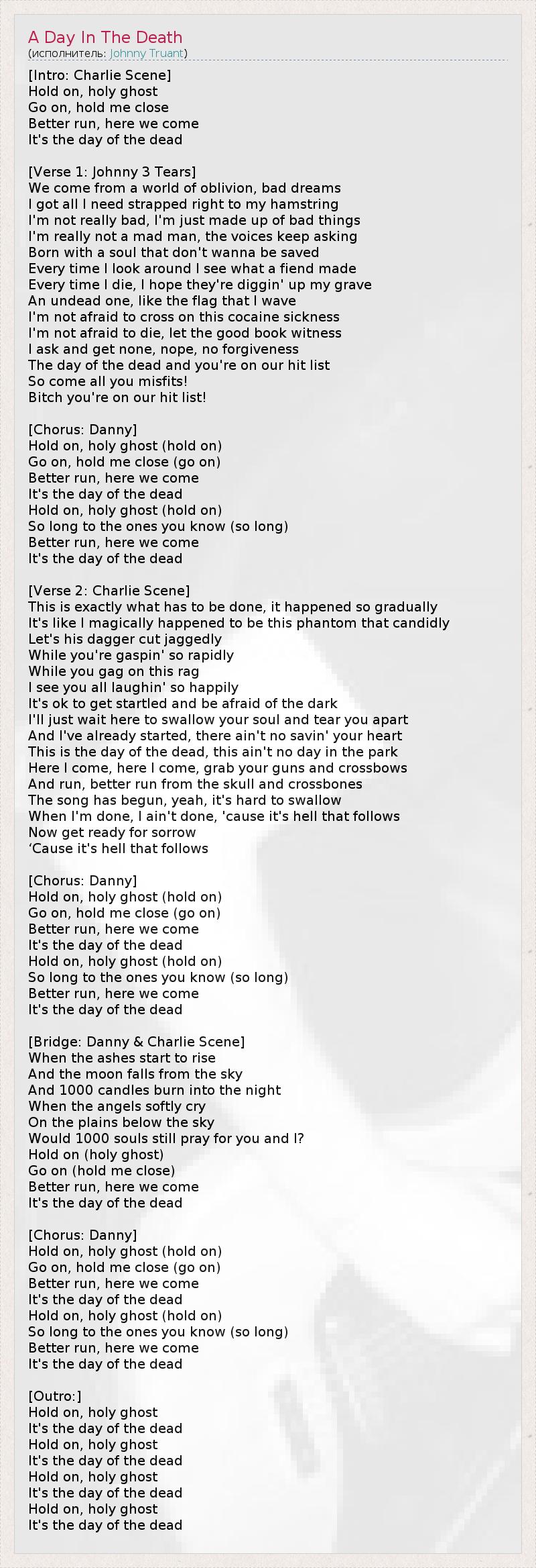 [Вступление: Charlie Scene] Постой, Дух Святой. Вперед, давайте за мной. Лучше беги, мы впереди. Настал день мертвых. [Куплет 1: Johnny 3 Tears] Мы родом из мира забвения и кошмарных снов. Со мной всё, что мне нужно, я вооружен до зубов. 1 Я не просто ужасен, я соткан из зла. Серьезно, я не безумец, но голоса всё кричат в голове. 2 Я рожден с душой, не желающей спасенья. Каждый раз, оглядываясь вокруг, я вижу содеянное дьяволом. Каждый раз, погибая, я надеюсь, что раскопают мою могилу. Я восстаю из мертвых и иду с их флагом. Я не боюсь откинуть копыта от наркозависимости, Я не боюсь умереть, клянусь Богом. 3 Я просил, но в ответ нет, нет, нет прощения. День мертвых, и ты в нашем черном списке. А ну все, негодяи, выходите! С*ка, ты в нашем черном списке. [Припев: Danny] Постой, Дух Святой, (постой) Давай, попробуй приблизиться ко мне! (ну же) А лучше беги, ведь идём мы! Настал день мертвых! Постой, Дух Святой, (постой) Попрощайся с теми, кого знал (попрощайся) Лучше беги, ведь идём мы! Настал день мертвых! [Куплет 2: Charlie Scene] Мало-помалу произошло именно то, что давно назревало. И честно, я словно по волшебству оказался призраком. Пусть мой нож рубит кромсая, Пока ты так часто и жадно хватаешь воздух И эта тряпка колом стоит тебя в горле. 4 Я вижу, как все радостно смеются. Ничего, если ты встревожен и боишься темноты. Я просто жду тебя в ней, чтобы поглотить твою душу, разорвав на куски. Процесс запущен, и твоё сердце уже не спасти. Вот он - день мертвых, прогулок в парке не будет. Я иду, я иду, хватайте стволы и арбалеты, И бегите, лучше удирайте от черепов и костей. 5 Песня началась, точняк, это трудно стерпеть. Когда я закончу, мне будет мало, и после я затащу тебя в ад. 6 Теперь готовься к мученьям, Ведь впереди преисподняя. [Припев: Danny] Постой, Дух Святой, (постой) Давай, попробуй приблизиться ко мне! (ну же) А лучше беги, ведь идём мы! Настал день мертвых! Постой, Дух Святой, (постой) Попрощайся с теми, кого знал (попрощайся) Лучше беги, ведь идём мы! Настал день мертвых! [Переход: Danny & Charlie Scene] Когда всё восстанет из пепла И луна упадёт с небосвода, Когда тысяча свечей загорится в ночи И ангелы тихо зарыдают На равнинах под небесами, Будет ли слышна мольба тысячи душ за нас с тобой? Постой, Дух Святой, (постой), Давай (попробуй приблизиться ко мне!) А лучше беги, ведь идём мы! Настал день мертвых! [Припев: Danny] Постой, Дух Святой, (постой) Давай, попробуй приблизиться ко мне! (ну же) А лучше беги, ведь идём мы! Настал день мертвых! Постой, Дух Святой, (постой) Попрощайся с теми, кого знал (попрощайся) Лучше беги, ведь идём мы! Настал день мертвых! [Конец:] Постой, Дух Святой. Настал день мертвых! Постой, Дух Святой. Настал день мертвых! Постой, Дух Святой. Настал день мертвых! Постой, Дух Святой. Настал день мертвых! 1 – strapped (сленг) – вооружённый, имеющий при себе оружие. Словосочетание "right to hamstring" в данном случае можно перевести как "до зубов", так как слово "right" показывает степень вооруженности, а "to hamstring" (=до сухожилий) – пределы наличия оружия. 2 – Противоречие, которое подчеркивает, что он безумец. В начале строчки он говорит, что он не безумец, но затем утверждает, что голоса в голове, продолжают спрашивать его, лишился ли он рассудка или нет. 3 – the good book witness – клясться на Библии, Богом. 4 – В песне "Dead Bite" Чарли уже говорил о подобной тряпке. Она была пропитана хлороформом. 5 – skull and crossbones – черепа и кости (эмблема смерти), изображени