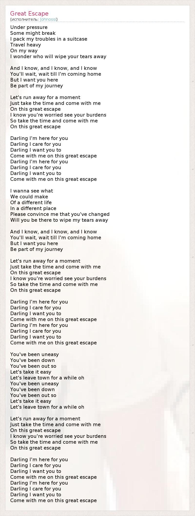 Under pressure Some might break I pack my troubles in a suitcase Travel heavy On my way I wonder who will wipe your tears away And I know, and I know, and I know You'll wait, wait till I'm coming home But I want you here Be part of my journey Let's run away for a moment Just take the time and come with me On this great escape I know you're worried see your burdens So take the time and come with me On this great escape Darling I'm here for you Darling I care for you Darling I want you to Come with me on this great escape Darling I'm here for you Darling I care for you Darling I want you to Come with me on this great escape I wanna see what We could make Of a different life In a different place Please convince me that you've changed Will you be there to wipe my tears away And I know, and I know, and I know You'll wait, wait till I'm coming home But I want you here Be part of my journey Let's run away for a moment Just take the time and come with me On this great escape I know you're worried see your burdens So take the time and come with me On this great escape Darling I'm here for you Darling I care for you Darling I want you to Come with me on this great escape Darling I'm here for you Darling I care for you Darling I want you to Come with me on this great escape You've been uneasy You've been down You've been out so Let's take it easy Let's leave town for a while oh You've been uneasy You've been down You've been out so Let's take it easy Let's leave town for a while oh Let's run away for a moment Just take the time and come with me On this great escape I know you're worried see your burdens So take the time and come with me On this great escape Darling I'm here for you Darling I care for you Darling I want you to Come with me on this great escape Darling I'm here for you Darling I care for you Darling I want you to Come with me on this great escape
