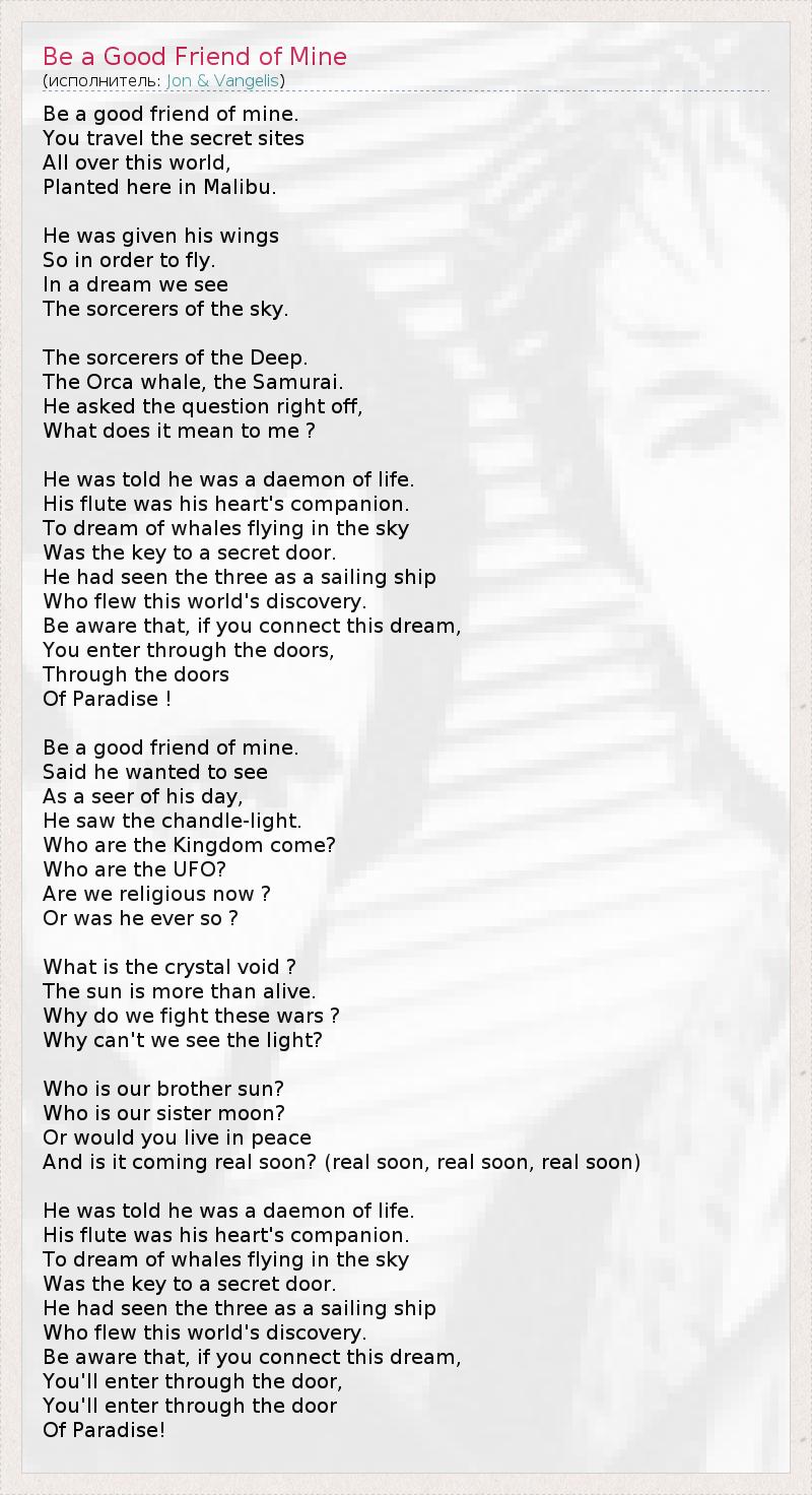 А как ты думаешь, о чем песня "Be a Good Friend of Mine" ?