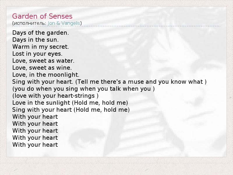 Days of the garden. Days in the sun. Warm in my secret. Lost in your eyes. Love, sweet as water. Love, sweet as wine. Love, in the moonlight. Sing with your heart. (Tell me there's a muse and you know what ) (you do when you sing when you talk when you ) (love with your heart-strings ) Love in the sunlight (Hold me, hold me) Sing with your heart (Hold me, hold me) With your heart With your heart With your heart With your heart With your heart