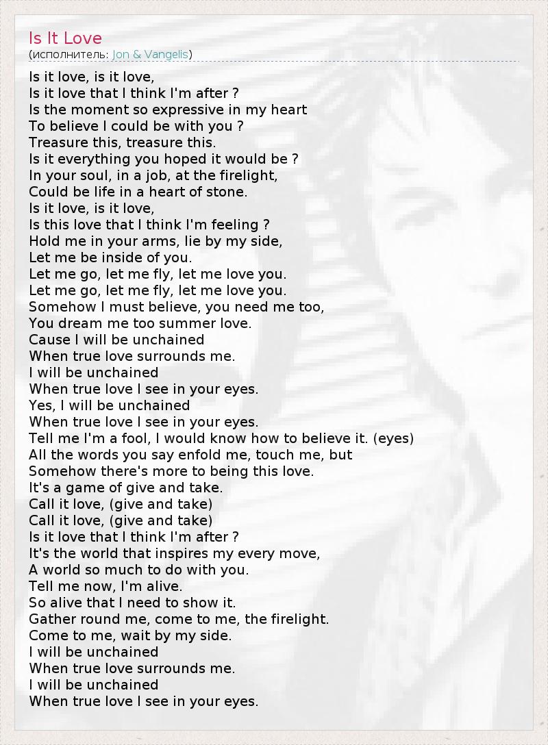 Is it love, is it love, Is it love that I think I'm after ? Is the moment so expressive in my heart To believe I could be with you ? Treasure this, treasure this. Is it everything you hoped it would be ? In your soul, in a job, at the firelight, Could be life in a heart of stone. Is it love, is it love, Is this love that I think I'm feeling ? Hold me in your arms, lie by my side, Let me be inside of you. Let me go, let me fly, let me love you. Let me go, let me fly, let me love you. Somehow I must believe, you need me too, You dream me too summer love. Cause I will be unchained When true love surrounds me. I will be unchained When true love I see in your eyes. Yes, I will be unchained When true love I see in your eyes. Tell me I'm a fool, I would know how to believe it. (eyes) All the words you say enfold me, touch me, but Somehow there's more to being this love. It's a game of give and take. Call it love, (give and take) Call it love, (give and take) Is it love that I think I'm after ? It's the world that inspires my every move, A world so much to do with you. Tell me now, I'm alive. So alive that I need to show it. Gather round me, come to me, the firelight. Come to me, wait by my side. I will be unchained When true love surrounds me. I will be unchained When true love I see in your eyes.