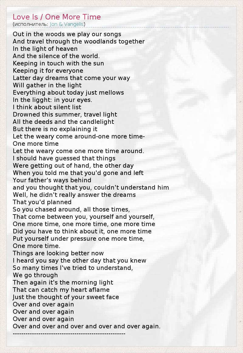 Out in the woods we play our songs And travel through the woodlands together In the light of heaven And the silence of the world. Keeping in touch with the sun Keeping it for everyone Latter day dreams that come your way Will gather in the light Everything about today just mellows In the ligght: in your eyes. I think about silent list Drowned this summer, travel light All the deeds and the candlelight But there is no explaining it Let the weary come around-one more time- One more time Let the weary come one more time around. I should have guessed that things Were getting out of hand, the other day When you told me that you'd gone and left Your father's ways behind and you thought that you, couldn't understand him Well, he didn't really answer the dreams That you'd planned So you chased around, all those times, That come between you, yourself and yourself, One more time, one more time, one more time Did you have to think about it, one more time Put yourself under pressure one more time, One more time. Things are looking better now I heard you say the other day that you knew So many times I've tried to understand, We go through Then again it's the morning light That can catch my heart aflame Just the thought of your sweet face Over and over again Over and over again Over and over again Over and over and over and over and over again. -----------------------------------------------------
