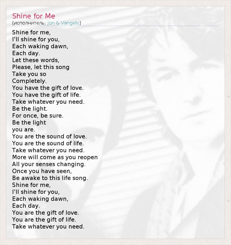 Shine for me, I'll shine for you, Each waking dawn, Each day. Let these words, Please, let this song Take you so Completely. You have the gift of love. You have the gift of life. Take whatever you need. Be the light. For once, be sure. Be the light you are. You are the sound of love. You are the sound of life. Take whatever you need. More will come as you reopen All your senses changing. Once you have seen, Be awake to this life song. Shine for me, I'll shine for you, Each waking dawn, Each day. You are the gift of love. You are the gift of life. Take whatever you need.