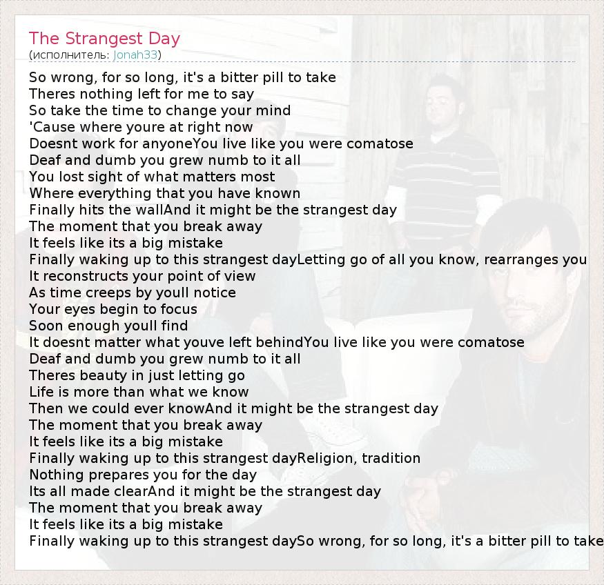 So wrong, for so long, it's a bitter pill to take Theres nothing left for me to say So take the time to change your mind 'Cause where youre at right now Doesnt work for anyoneYou live like you were comatose Deaf and dumb you grew numb to it all You lost sight of what matters most Where everything that you have known Finally hits the wallAnd it might be the strangest day The moment that you break away It feels like its a big mistake Finally waking up to this strangest dayLetting go of all you know, rearranges you It reconstructs your point of view As time creeps by youll notice Your eyes begin to focus Soon enough youll find It doesnt matter what youve left behindYou live like you were comatose Deaf and dumb you grew numb to it all Theres beauty in just letting go Life is more than what we know Then we could ever knowAnd it might be the strangest day The moment that you break away It feels like its a big mistake Finally waking up to this strangest dayReligion, tradition Nothing prepares you for the day Its all made clearAnd it might be the strangest day The moment that you break away It feels like its a big mistake Finally waking up to this strangest daySo wrong, for so long, it's a bitter pill to take
