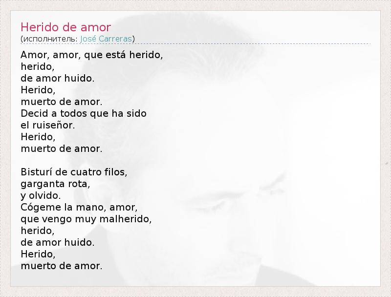 Amor, amor, que está herido, herido, de amor huido. Herido, muerto de amor. Decid a todos que ha sido el ruiseñor. Herido, muerto de amor. Bisturí de cuatro filos, garganta rota, y olvido. Cógeme la mano, amor, que vengo muy malherido, herido, de amor huido. Herido, muerto de amor.