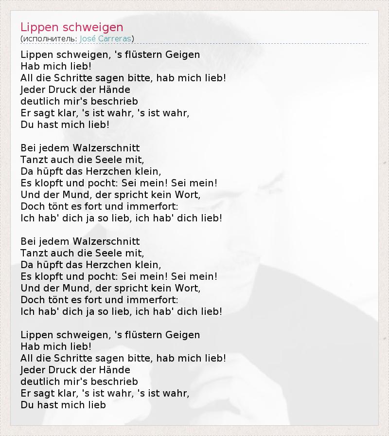 Lippen schweigen, 's flüstern Geigen Hab mich lieb! All die Schritte sagen bitte, hab mich lieb! Jeder Druck der Hände deutlich mir's beschrieb Er sagt klar, 's ist wahr, 's ist wahr, Du hast mich lieb! Bei jedem Walzerschnitt Tanzt auch die Seele mit, Da hüpft das Herzchen klein, Es klopft und pocht: Sei mein! Sei mein! Und der Mund, der spricht kein Wort, Doch tönt es fort und immerfort: Ich hab' dich ja so lieb, ich hab' dich lieb! Bei jedem Walzerschnitt Tanzt auch die Seele mit, Da hüpft das Herzchen klein, Es klopft und pocht: Sei mein! Sei mein! Und der Mund, der spricht kein Wort, Doch tönt es fort und immerfort: Ich hab' dich ja so lieb, ich hab' dich lieb! Lippen schweigen, 's flüstern Geigen Hab mich lieb! All die Schritte sagen bitte, hab mich lieb! Jeder Druck der Hände deutlich mir's beschrieb Er sagt klar, 's ist wahr, 's ist wahr, Du hast mich lieb