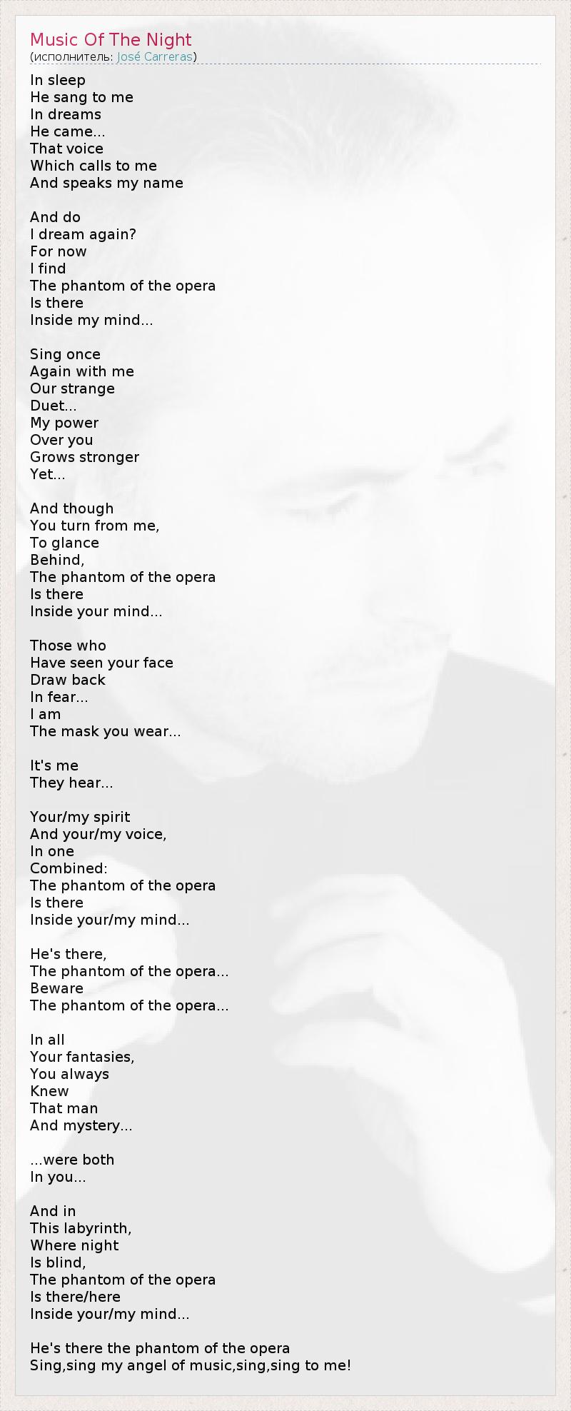 In sleep He sang to me In dreams He came... That voice Which calls to me And speaks my name And do I dream again? For now I find The phantom of the opera Is there Inside my mind... Sing once Again with me Our strange Duet... My power Over you Grows stronger Yet... And though You turn from me, To glance Behind, The phantom of the opera Is there Inside your mind... Those who Have seen your face Draw back In fear... I am The mask you wear... It's me They hear... Your/my spirit And your/my voice, In one Combined: The phantom of the opera Is there Inside your/my mind... He's there, The phantom of the opera... Beware The phantom of the opera... In all Your fantasies, You always Knew That man And mystery... ...were both In you... And in This labyrinth, Where night Is blind, The phantom of the opera Is there/here Inside your/my mind... He's there the phantom of the opera Sing,sing my angel of music,sing,sing to me!