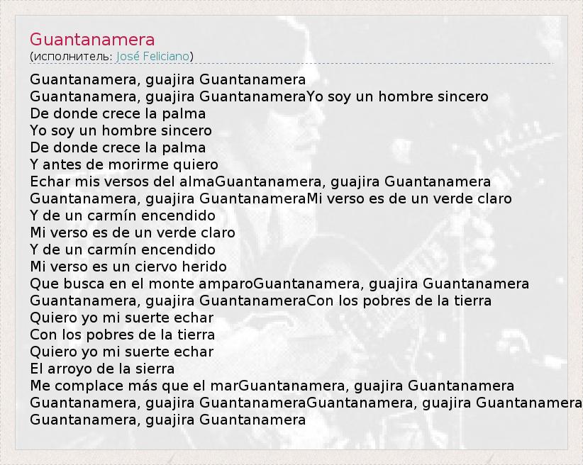 Guantanamera, guajira Guantanamera Guantanamera, guajira GuantanameraYo soy un hombre sincero De donde crece la palma Yo soy un hombre sincero De donde crece la palma Y antes de morirme quiero Echar mis versos del almaGuantanamera, guajira Guantanamera Guantanamera, guajira GuantanameraMi verso es de un verde claro Y de un carmín encendido Mi verso es de un verde claro Y de un carmín encendido Mi verso es un ciervo herido Que busca en el monte amparoGuantanamera, guajira Guantanamera Guantanamera, guajira GuantanameraCon los pobres de la tierra Quiero yo mi suerte echar Con los pobres de la tierra Quiero yo mi suerte echar El arroyo de la sierra Me complace más que el marGuantanamera, guajira Guantanamera Guantanamera, guajira GuantanameraGuantanamera, guajira Guantanamera Guantanamera, guajira Guantanamera