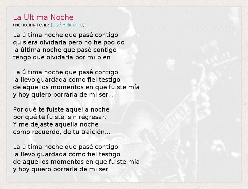 La última noche que pasé contigo quisiera olvidarla pero no he podido la última noche que pasé contigo tengo que olvidarla por mi bien. La última noche que pasé contigo la llevo guardada como fiel testigo de aquellos momentos en que fuiste mía y hoy quiero borrarla de mi ser... Por qué te fuiste aquella noche por qué te fuiste, sin regresar. Y me dejaste aquella noche como recuerdo, de tu traición... La última noche que pasé contigo la llevo guardada como fiel testigo de aquellos momentos en que fuiste mía y hoy quiero borrarla de mi ser.