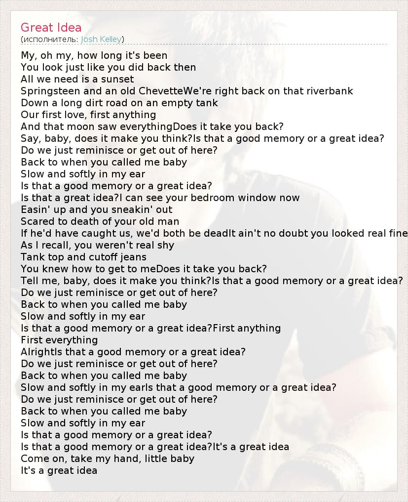 My, oh my, how long it's been You look just like you did back then All we need is a sunset Springsteen and an old ChevetteWe're right back on that riverbank Down a long dirt road on an empty tank Our first love, first anything And that moon saw everythingDoes it take you back? Say, baby, does it make you think?Is that a good memory or a great idea? Do we just reminisce or get out of here? Back to when you called me baby Slow and softly in my ear Is that a good memory or a great idea? Is that a great idea?I can see your bedroom window now Easin' up and you sneakin' out Scared to death of your old man If he'd have caught us, we'd both be deadIt ain't no doubt you looked real fine As I recall, you weren't real shy Tank top and cutoff jeans You knew how to get to meDoes it take you back? Tell me, baby, does it make you think?Is that a good memory or a great idea? Do we just reminisce or get out of here? Back to when you called me baby Slow and softly in my ear Is that a good memory or a great idea?First anything First everything AlrightIs that a good memory or a great idea? Do we just reminisce or get out of here? Back to when you called me baby Slow and softly in my earIs that a good memory or a great idea? Do we just reminisce or get out of here? Back to when you called me baby Slow and softly in my ear Is that a good memory or a great idea? Is that a good memory or a great idea?It's a great idea Come on, take my hand, little baby It's a great idea