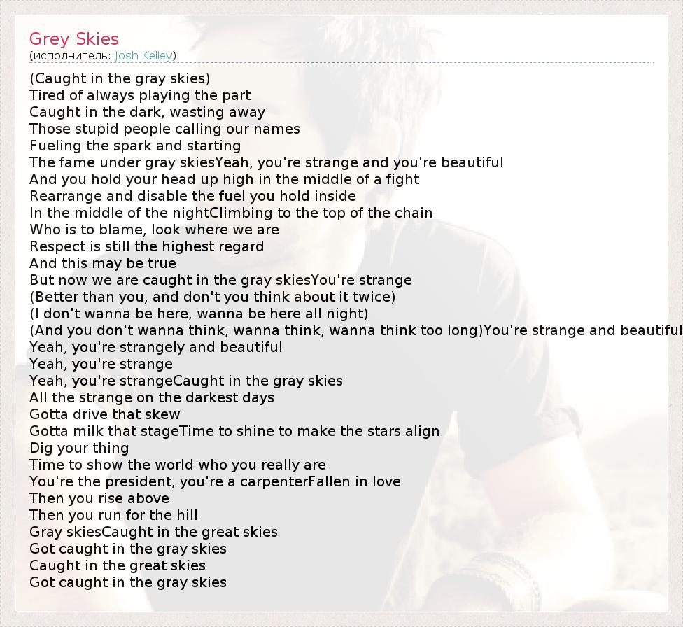 (Caught in the gray skies) Tired of always playing the part Caught in the dark, wasting away Those stupid people calling our names Fueling the spark and starting The fame under gray skiesYeah, you're strange and you're beautiful And you hold your head up high in the middle of a fight Rearrange and disable the fuel you hold inside In the middle of the nightClimbing to the top of the chain Who is to blame, look where we are Respect is still the highest regard And this may be true But now we are caught in the gray skiesYou're strange (Better than you, and don't you think about it twice) (I don't wanna be here, wanna be here all night) (And you don't wanna think, wanna think, wanna think too long)You're strange and beautiful Yeah, you're strangely and beautiful Yeah, you're strange Yeah, you're strangeCaught in the gray skies All the strange on the darkest days Gotta drive that skew Gotta milk that stageTime to shine to make the stars align Dig your thing Time to show the world who you really are You're the president, you're a carpenterFallen in love Then you rise above Then you run for the hill Gray skiesCaught in the great skies Got caught in the gray skies Caught in the great skies Got caught in the gray skies
