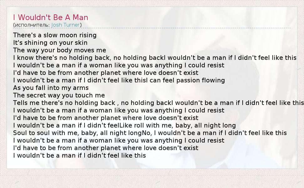 There's a slow moon rising It's shining on your skin The way your body moves me I know there's no holding back, no holding backI wouldn't be a man if I didn't feel like this I wouldn't be a man if a woman like you was anything I could resist I'd have to be from another planet where love doesn't exist I wouldn't be a man if I didn't feel like thisI can feel passion flowing As you fall into my arms The secret way you touch me Tells me there's no holding back , no holding backI wouldn't be a man if I didn't feel like this I wouldn't be a man if a woman like you was anything I could resist I'd have to be from another planet where love doesn't exist I wouldn't be a man if I didn't feelLike roll with me, baby, all night long Soul to soul with me, baby, all night longNo, I wouldn't be a man if I didn't feel like this I wouldn't be a man if a woman like you was anything I could resist I'd have to be from another planet where love doesn't exist I wouldn't be a man if I didn't feel like this