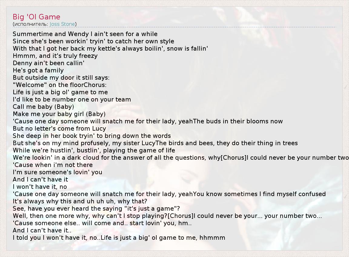 А как ты думаешь, о чем песня "Big 'Ol Game" ?