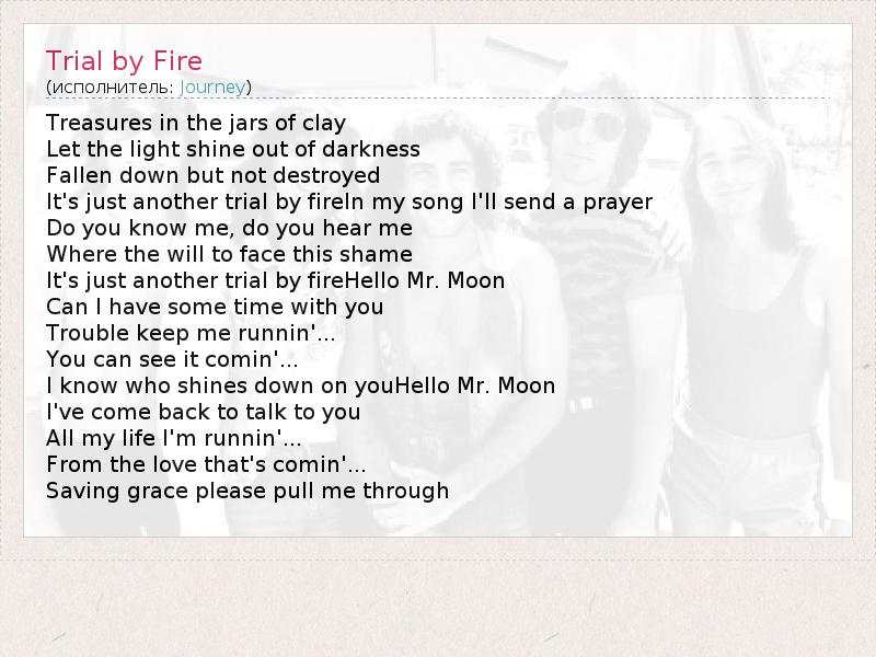 Treasures in the jars of clay Let the light shine out of darkness Fallen down but not destroyed It's just another trial by fireIn my song I'll send a prayer Do you know me, do you hear me Where the will to face this shame It's just another trial by fireHello Mr. Moon Can I have some time with you Trouble keep me runnin'... You can see it comin'... I know who shines down on youHello Mr. Moon I've come back to talk to you All my life I'm runnin'... From the love that's comin'... Saving grace please pull me through