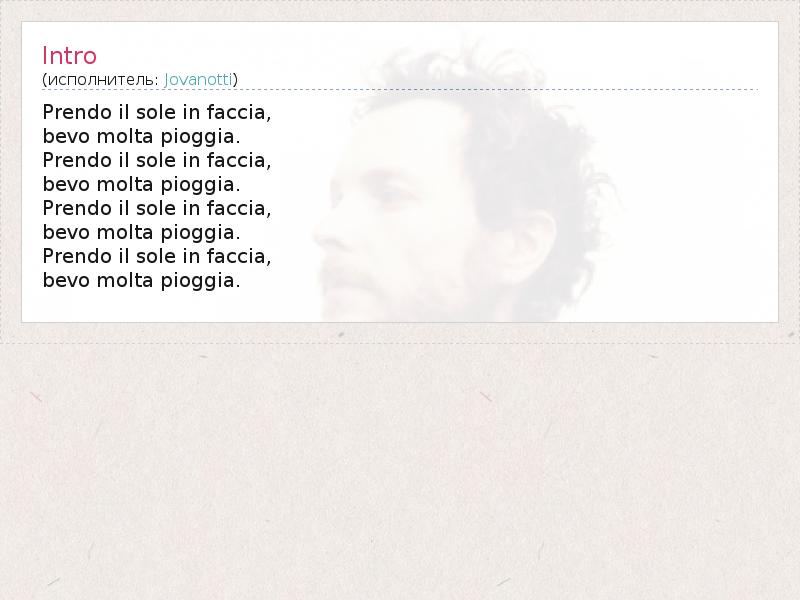 Это интересно:Jovanotti (часто пишется как Giovanotti) итальянский автор-исполнитель и рэппер. Jovanotti, чьё настоящее имя Lorenzo Cherubini, родился в Риме 27 сентября 1966 года. Его семья из Cortona, провинция Arezzo, Tuscany. 6 сентября 2008 он женился на Francesca Valiani в Cortona, в церкви Santa Maria Nuova. Их дочь Teresa родилась в 1998. Колыбельная "per te" посвященная Терезе, одна из составляющих успеха альбома Capo Horn (1999).От смеси хип-хопа, рэпа и диско... продолжение