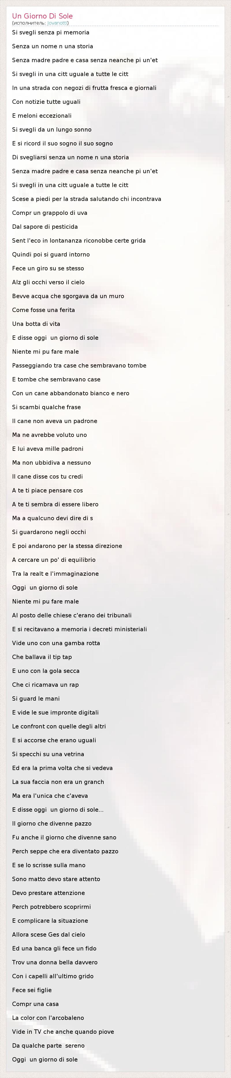 Si svegli senza pi memoria Senza un nome n una storia Senza madre padre e casa senza neanche pi un'et Si svegli in una citt uguale a tutte le citt In una strada con negozi di frutta fresca e giornali Con notizie tutte uguali E meloni eccezionali Si svegli da un lungo sonno E si ricord il suo sogno il suo sogno Di svegliarsi senza un nome n una storia Senza madre padre e casa senza neanche pi un'et Si svegli in una citt uguale a tutte le citt Scese a piedi per la strada salutando chi incontrava Compr un grappolo di uva Dal sapore di pesticida Sent l'eco in lontananza riconobbe certe grida Quindi poi si guard intorno Fece un giro su se stesso Alz gli occhi verso il cielo Bevve acqua che sgorgava da un muro Come fosse una ferita Una botta di vita E disse oggi un giorno di sole Niente mi pu fare male Passeggiando tra case che sembravano tombe E tombe che sembravano case Con un cane abbandonato bianco e nero Si scambi qualche frase Il cane non aveva un padrone Ma ne avrebbe voluto uno E lui aveva mille padroni Ma non ubbidiva a nessuno Il cane disse cos tu credi A te ti piace pensare cos A te ti sembra di essere libero Ma a qualcuno devi dire di s Si guardarono negli occhi E poi andarono per la stessa direzione A cercare un po' di equilibrio Tra la realt e l'immaginazione Oggi un giorno di sole Niente mi pu fare male Al posto delle chiese c'erano dei tribunali E si recitavano a memoria i decreti ministeriali Vide uno con una gamba rotta Che ballava il tip tap E uno con la gola secca Che ci ricamava un rap Si guard le mani E vide le sue impronte digitali Le confront con quelle degli altri E si accorse che erano uguali Si specchi su una vetrina Ed era la prima volta che si vedeva La sua faccia non era un granch Ma era l'unica che c'aveva E disse oggi un giorno di sole... Il giorno che divenne pazzo Fu anche il giorno che divenne sano Perch seppe che era diventato pazzo E se lo scrisse sulla mano Sono matto devo stare attento Devo prestare attenzione Perch potrebbero scoprirmi E complicare la situazione Allora scese Ges dal cielo Ed una banca gli fece un fido Trov una donna bella davvero Con i capelli all'ultimo grido Fece sei figlie Compr una casa La color con l'arcobaleno Vide in TV che anche quando piove Da qualche parte sereno Oggi un giorno di sole