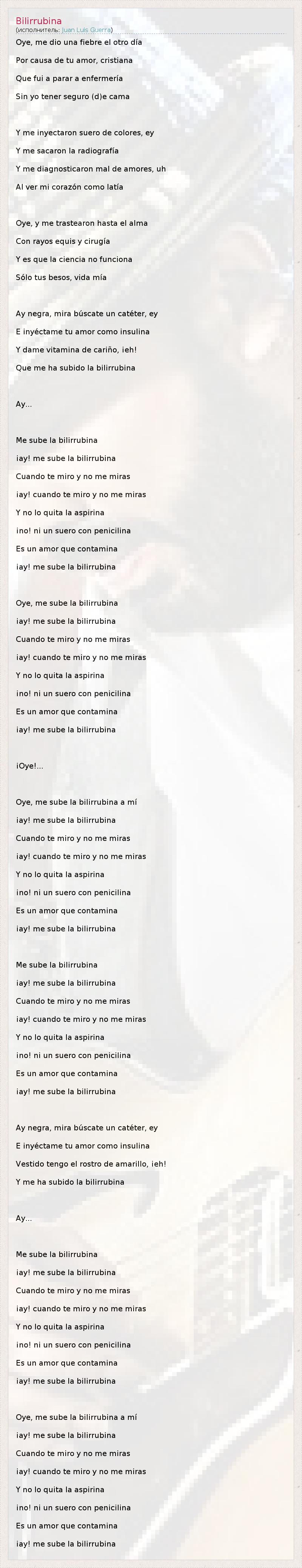 Oye, me dio una fiebre el otro día Por causa de tu amor, cristiana Que fui a parar a enfermería Sin yo tener seguro (d)e cama Y me inyectaron suero de colores, ey Y me sacaron la radiografía Y me diagnosticaron mal de amores, uh Al ver mi corazón como latía Oye, y me trastearon hasta el alma Con rayos equis y cirugía Y es que la ciencia no funciona Sólo tus besos, vida mía Ay negra, mira búscate un catéter, ey E inyéctame tu amor como insulina Y dame vitamina de cariño, ¡eh! Que me ha subido la bilirrubina Ay... Me sube la bilirrubina ¡ay! me sube la bilirrubina Cuando te miro y no me miras ¡ay! cuando te miro y no me miras Y no lo quita la aspirina ¡no! ni un suero con penicilina Es un amor que contamina ¡ay! me sube la bilirrubina Oye, me sube la bilirrubina ¡ay! me sube la bilirrubina Cuando te miro y no me miras ¡ay! cuando te miro y no me miras Y no lo quita la aspirina ¡no! ni un suero con penicilina Es un amor que contamina ¡ay! me sube la bilirrubina ¡Oye!... Oye, me sube la bilirrubina a mí ¡ay! me sube la bilirrubina Cuando te miro y no me miras ¡ay! cuando te miro y no me miras Y no lo quita la aspirina ¡no! ni un suero con penicilina Es un amor que contamina ¡ay! me sube la bilirrubina Me sube la bilirrubina ¡ay! me sube la bilirrubina Cuando te miro y no me miras ¡ay! cuando te miro y no me miras Y no lo quita la aspirina ¡no! ni un suero con penicilina Es un amor que contamina ¡ay! me sube la bilirrubina Ay negra, mira búscate un catéter, ey E inyéctame tu amor como insulina Vestido tengo el rostro de amarillo, ¡eh! Y me ha subido la bilirrubina Ay... Me sube la bilirrubina ¡ay! me sube la bilirrubina Cuando te miro y no me miras ¡ay! cuando te miro y no me miras Y no lo quita la aspirina ¡no! ni un suero con penicilina Es un amor que contamina ¡ay! me sube la bilirrubina Oye, me sube la bilirrubina a mí ¡ay! me sube la bilirrubina Cuando te miro y no me miras ¡ay! cuando te miro y no me miras Y no lo quita la aspirina ¡no! ni un suero con penicilina Es un amor que contamina ¡ay! me sube la bilirrubina